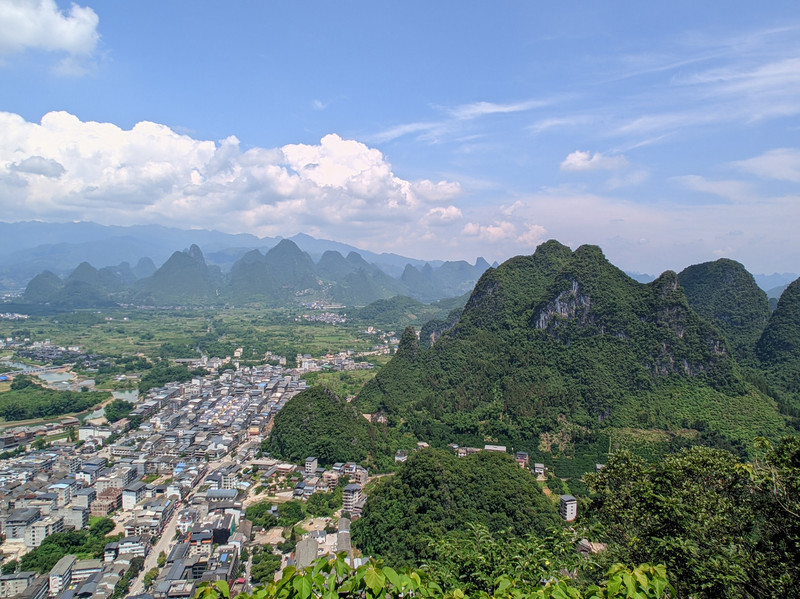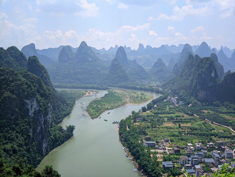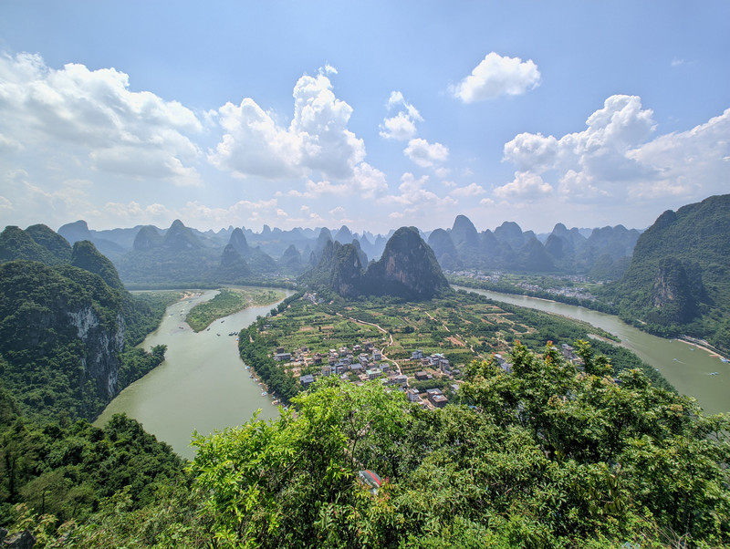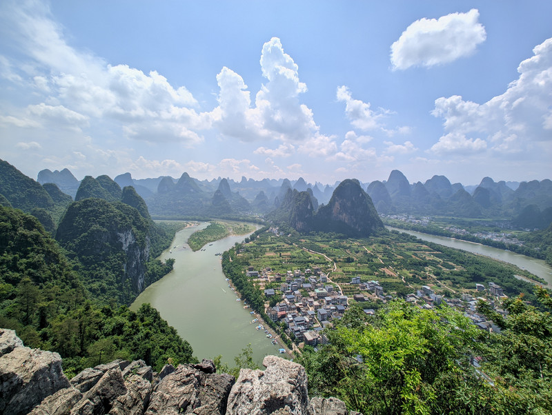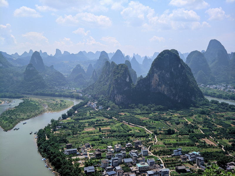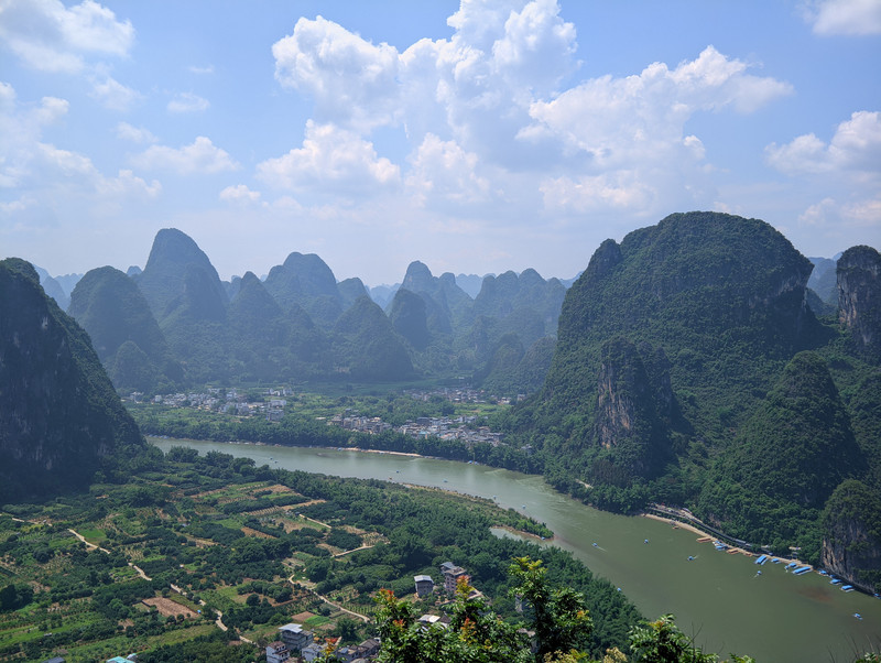 最好的观景点,在亭子再往上一点岩石上,因为没有栏杆,注意安全。高处看到漓江和远处的山景,就会觉得辛苦爬山是值得的。