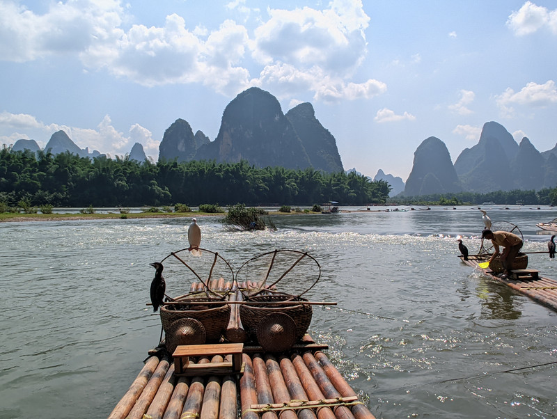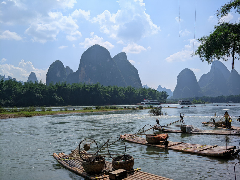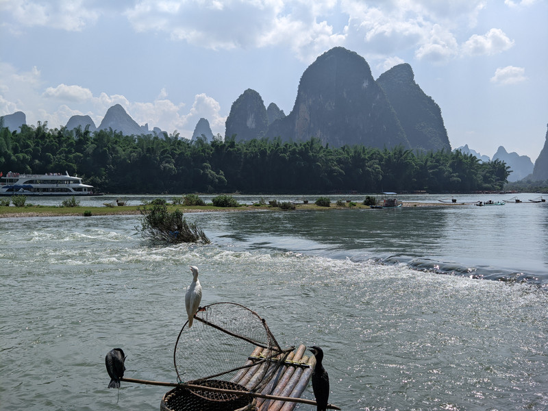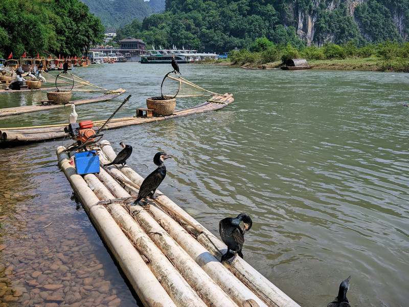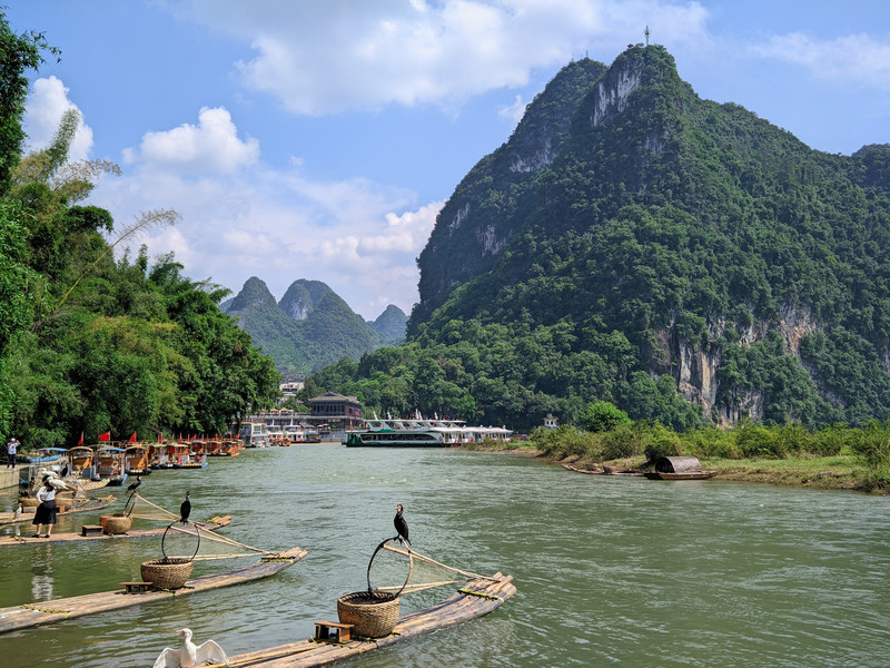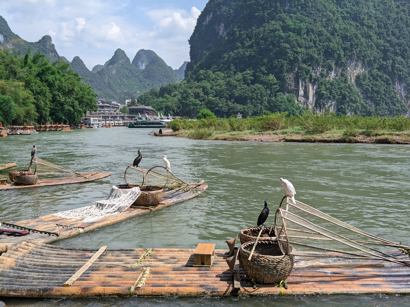 20元人民币的背景拍照有2处,一个是游船码头旁边的免费观景台,这个点比较烂,被游船遮挡严重,主要是方便帮忙拍照的商家赚钱;还有一个点非常推荐,导航搜索旺旺美食那里,到达后,就会发现河边有一个观景点,视野开阔,和渔民谈好的话上竹筏摆拍和逗鸬鹚都行。这个点可以慢慢拍,好好拍,玩到腻为止。