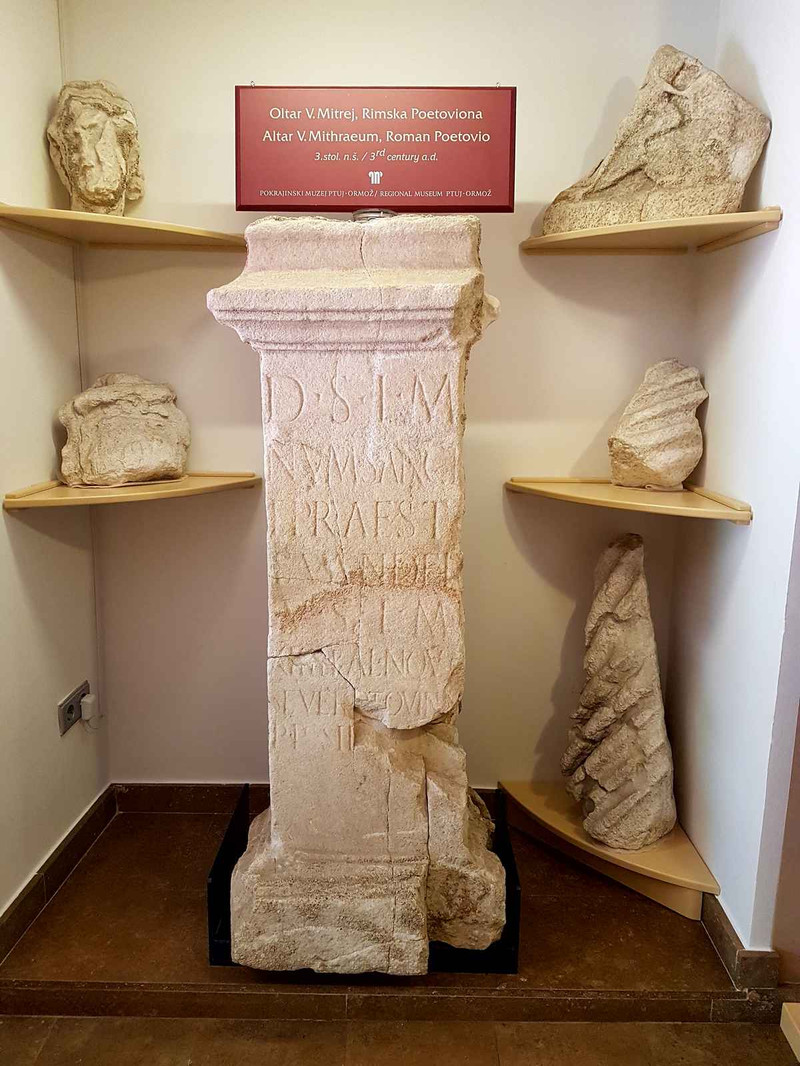 从广场继续沿着普图伊最古老的街道——普列舍诺瓦大街(Prešernova ulica)前行,可以在密特拉酒店(Mitra Hotel)稍作停留,酒店名字让人联想到古代波斯人对密特拉神(Mithras,波斯神话中的光明之神)的崇拜。酒店大堂里有第五密特拉神庙考古遗迹(The 5th Mithraeum)(6),此外酒店花园里还有从岩石中诞生的密特拉神雕像的复制品。
