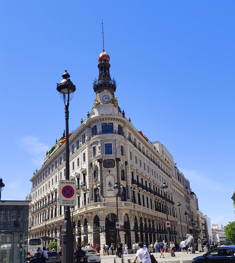 太阳门广场的南边矗立着标志性的老邮政大楼,这座古老的建筑红白相间,形似一幢雄伟的宫殿。大楼正中的钟楼很有名,每到新年前夕,马德里人都会聚集于此,在午夜12点钟声敲响之际,吃下象征好运的12颗葡萄,庆祝新年的到来。