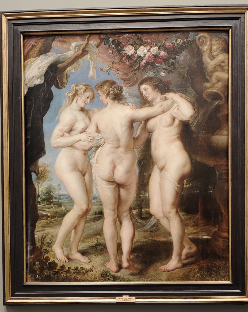 三位女神互相拥抱,形成一个圆圈,就像一些古代雕塑和文艺复兴时期绘画中的那样。脚的位置表明妇女们正在轻柔地跳舞。景观向远处的蓝色背景延伸,强烈的光线从那里透过树木。鲁本斯并不追求现实,而是用自己的光线使人物和风景充满活力。