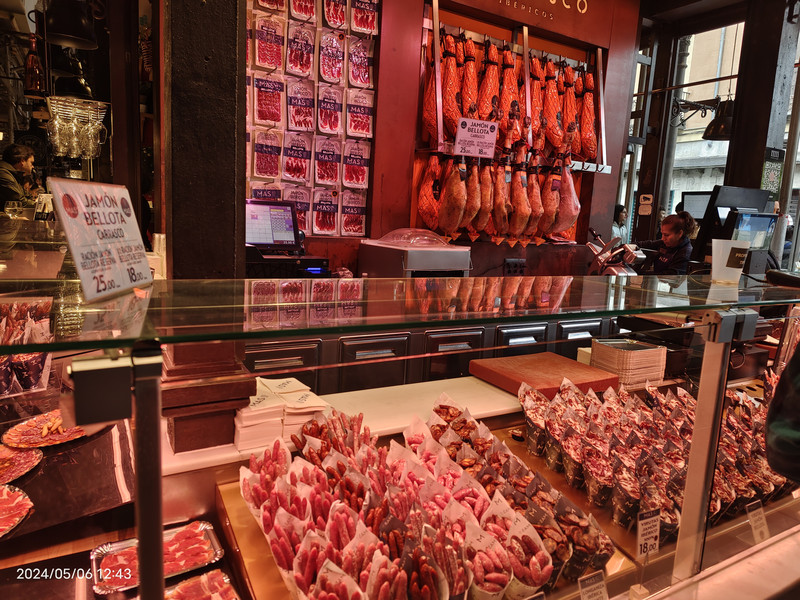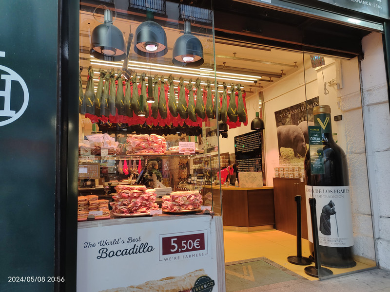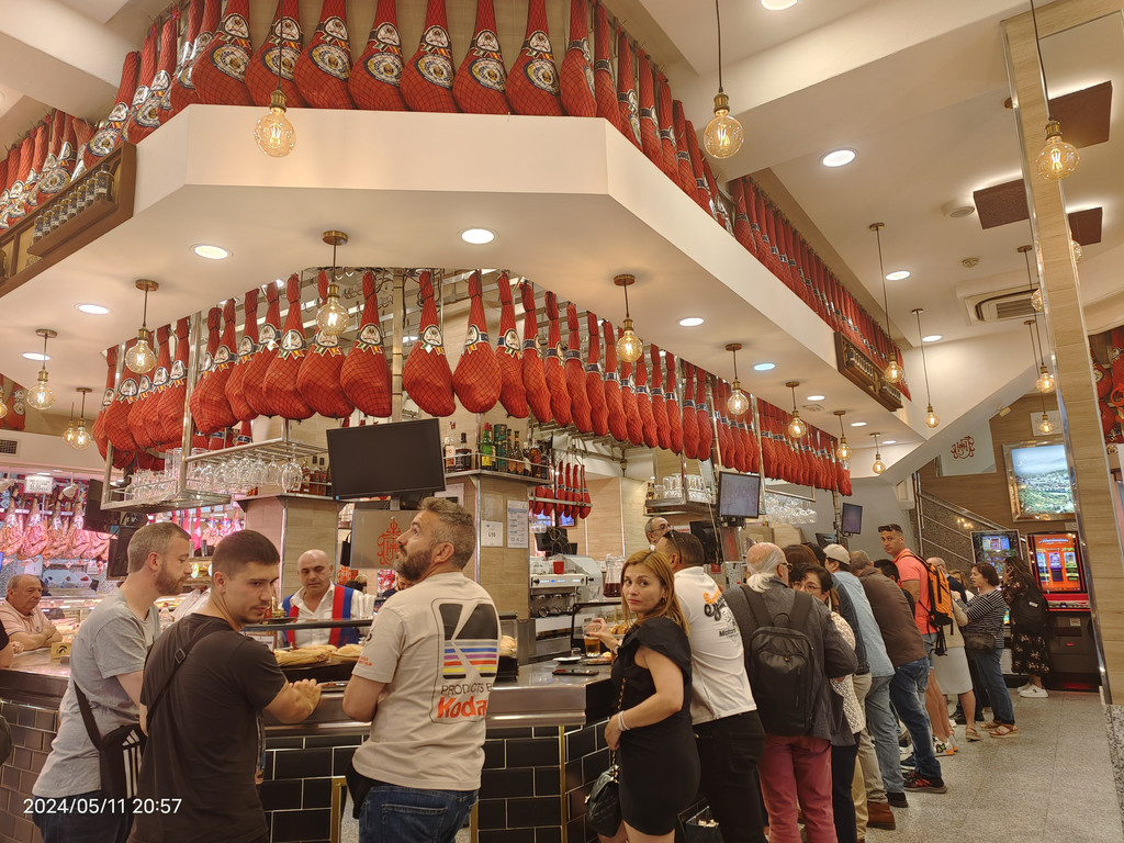 在格兰大道这家店专卖火腿的,各式各样的火腿琳琅满目、价格不一,也可以坐在吧台上堂吃。