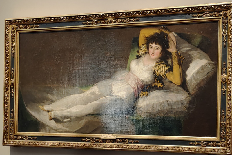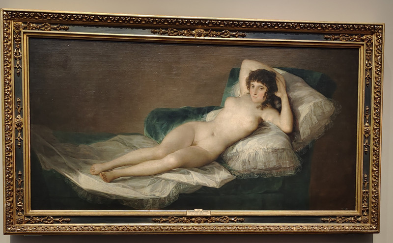 《裸体的马哈》是戈雅在 1797-1800 年左右创作的一幅布面油画,它描绘了一名裸体女子斜倚在铺满枕头的床上。这幅画以模特直率而毫无羞耻地凝视观众而闻名。