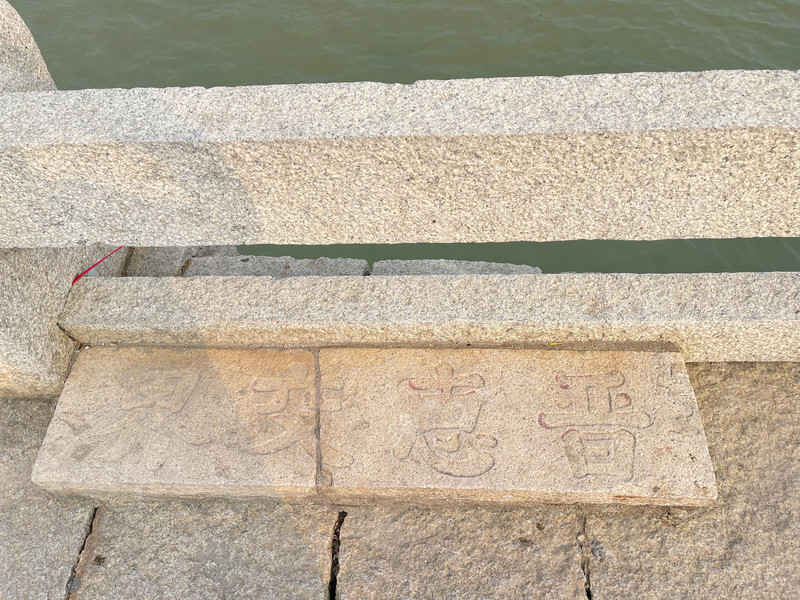 桥面上可见一块“晋惠交界”的石碑平铺在地。洛阳桥的南边为泉州洛江区,北边为惠安县,惠安是蔡襄母亲的故乡,蔡襄为了筹措建桥资金,与母亲卢氏带头捐资,带动社会各界纷纷响应支持,造桥资金很快落实到位。
