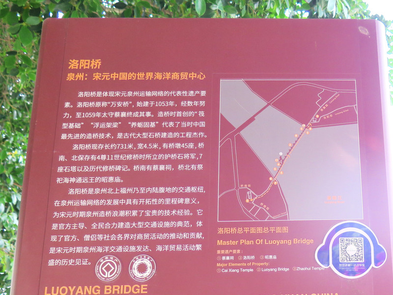泉州的古桥文化非常丰富,其中最著名的当属“五里长桥”-安平桥和“海内第一桥”-洛阳桥。洛阳桥历史更为悠久,始建于北宋庆历年间(1041年至1048年),比安平桥早了近百年。洛阳桥位于泉州市洛江区与惠安交界处的洛阳江水道之上,全长731米,宽4.5米,有45座石墩,桥面左右翼以望柱、扶栏。桥南有蔡襄祠,桥北有祭祀海神通远王的昭惠庙。桥面上还保存有4尊11世纪修桥时所立的护桥石将军,7座石塔以及历代修桥碑记。2021年7月25日,泉州被列入《世界文化遗产名录》,洛阳桥是22处代表性古迹遗址之一。洛阳桥北通达洛阳街,这里是中国传统村落万安村,街道两边房屋看着比较新,红砖建筑,闽南风格,夹杂南洋元素。洛阳水上交通尤为方便,在桥头、海尾及吴厝祠堂埕脚设有3个码头。由于是交通要道,商贸发达,这条街上当时开着许多商铺。