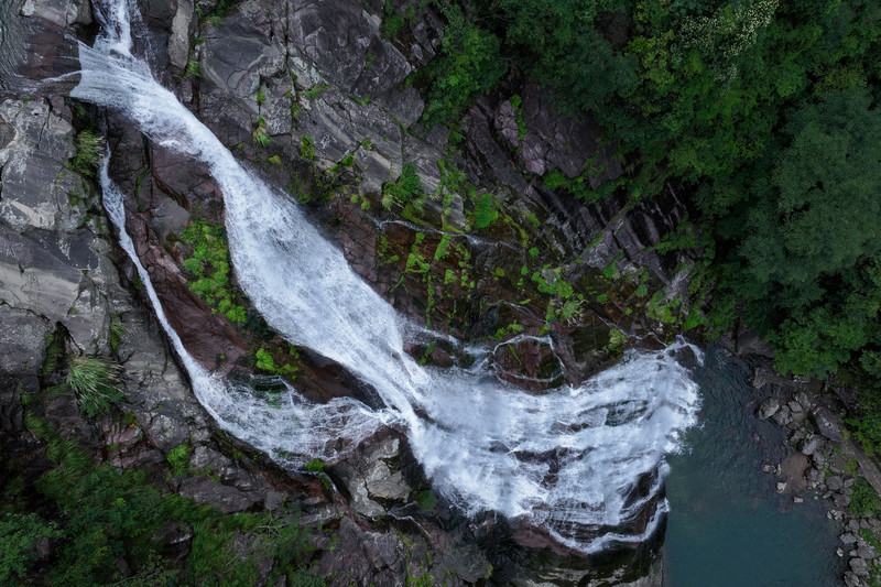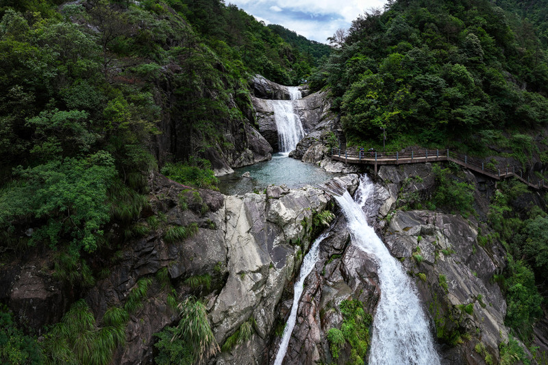 百杖潭景区靠近诸永高速(S26)双峰互通口,仅需10分钟车程即可到达。景区内的百杖三叠瀑是国内罕见的冰臼瀑布,被誉为“江南第一瀑”,瀑布总高度达到72米,由三级瀑布组成。每一级瀑布都有其独特的风貌,从第一级10米高的幕帘状瀑布,到第二级15米高的喷泻状瀑布,再到第三级47米高的沿陡崖泄下的瀑布,每一级都各具特色,共同构成了这一独特的瀑布景观。