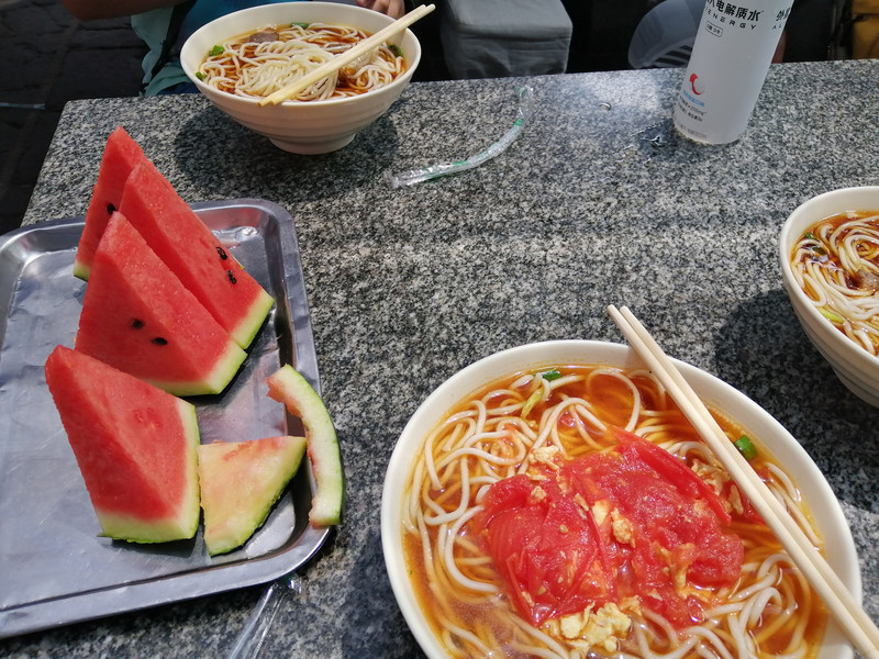 在这里吃午饭。这里西瓜是称重卖的,五片西瓜17块。再加两碗牛肉面,一碗西红柿鸡蛋面连西瓜一共87 背包里带的水也喝差不多了。在这里10块钱买了4瓶。