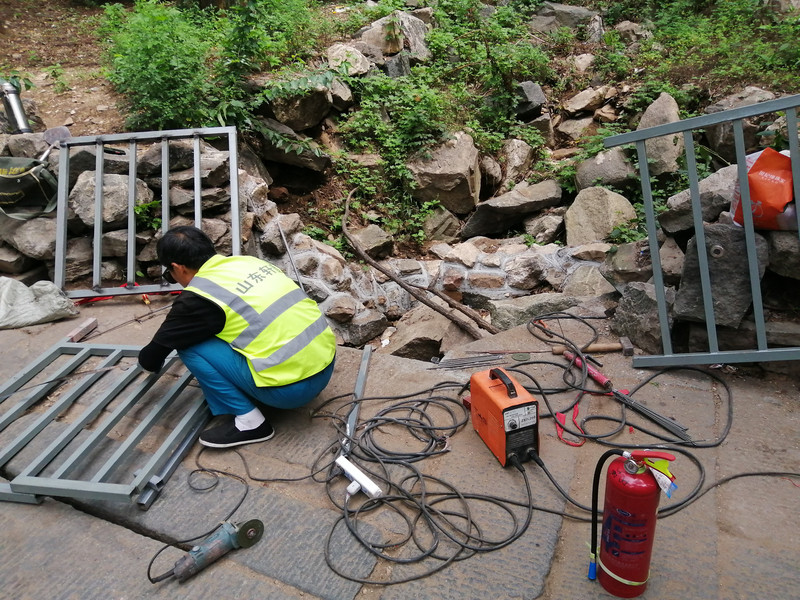 工人在安装护栏。不容易!护栏和安装设备都要人工扛上来。