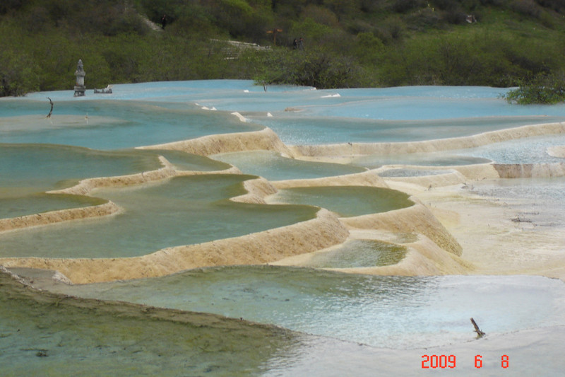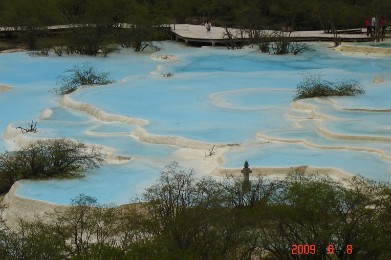 距九寨沟145公里的黄龙,位于岷山主峰雪宝顶下,是中国唯一保护完好的高原湿地,碳酸钙华沉积是黄龙景观的最大特色,长约3.6公里的黄龙沟内连绵不断,钙华遍布,并呈梯田状排列,彩池多达3400余个,最大的钙化滩长1300米,其钙化景观不仅规模宏大、结构奇巧、色彩丰艳,而且类型繁多、齐全,钙化边石坝彩池、钙化滩、