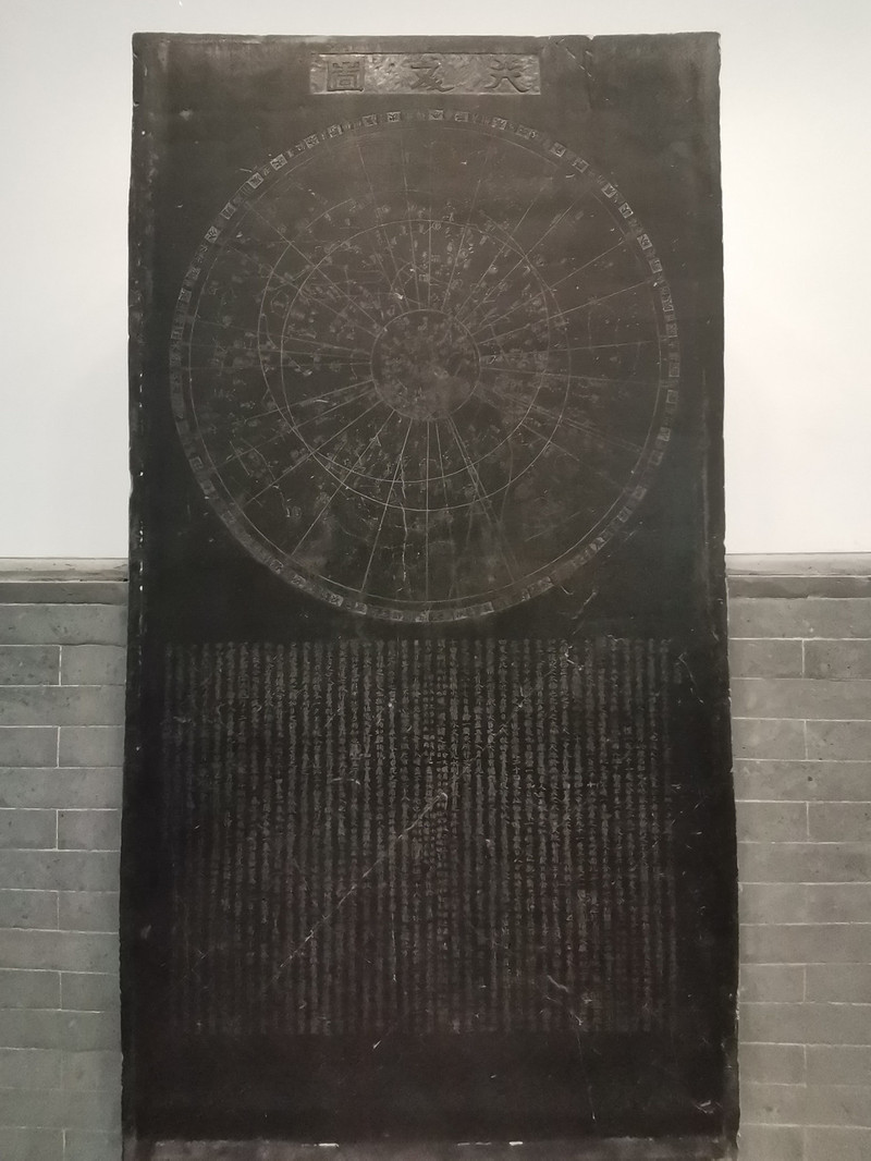 北宋时先后进行过五次大规模的天体观测,其中元丰年间(公元1078~1085年)第四次观测的成绩尤为显著。南宋宁宗朝礼部尚书黄裳依据实测资料绘成星图,撰写释文。理宗淳祐七年(公元1247年)由王致远镌刻成“天文图"石碑,上半部分刻星图,下半部分刻释文。星图中刻绘有三个同心圆,内圆直径19.9cm,圆内所刻诸星是在北纬35°线(北宋东京所在的地理纬度)看到的天球北极附近全年皆见的恒星,此圆被称为常见圈(恒显圈)。中圆直径52.5cm,是天球赤道;另有一偏心圆与赤道相交,直径大致相等为黄道圈;赤道与黄道的交角接近24°(现代科学实测是23°26')。外圆直径85cm,圆内所刻诸星是天球赤道以南55°线之内的恒星,亦即从北纬35线向南观望能见到的恒星,所以外圆又被称为边界圈(恒隐圈)。星图中有辐射状的28道不等宽的宿度线,以区分28宿,又用双曲线勾勒出银河。全图共刻绘了1434颗恒星,而欧洲国家直到公元14世纪才观测到1022颗。