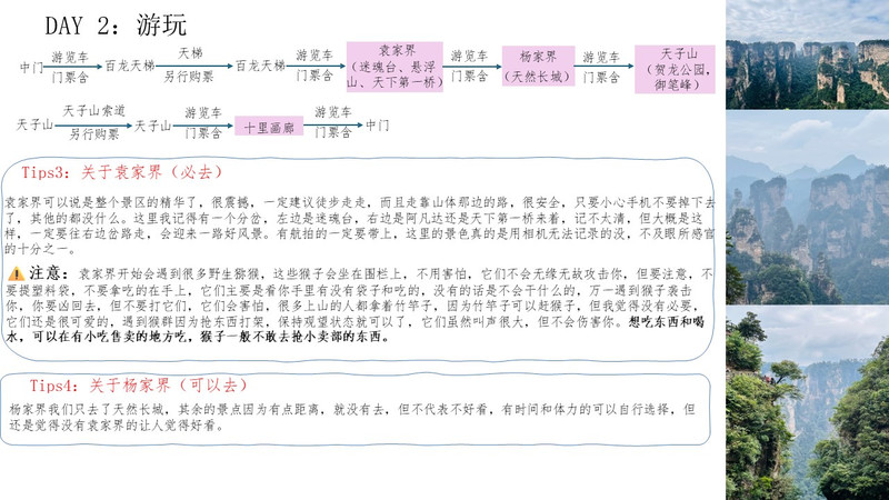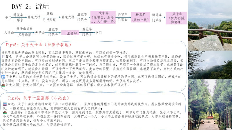- 下午:前往天子山,游览贺龙公园、御笔峰等景点。
