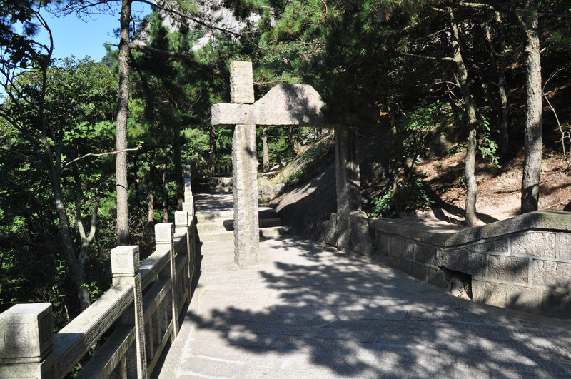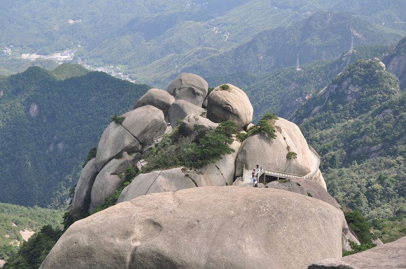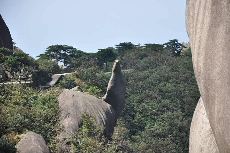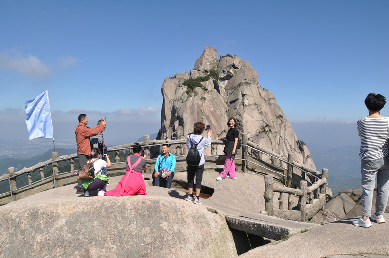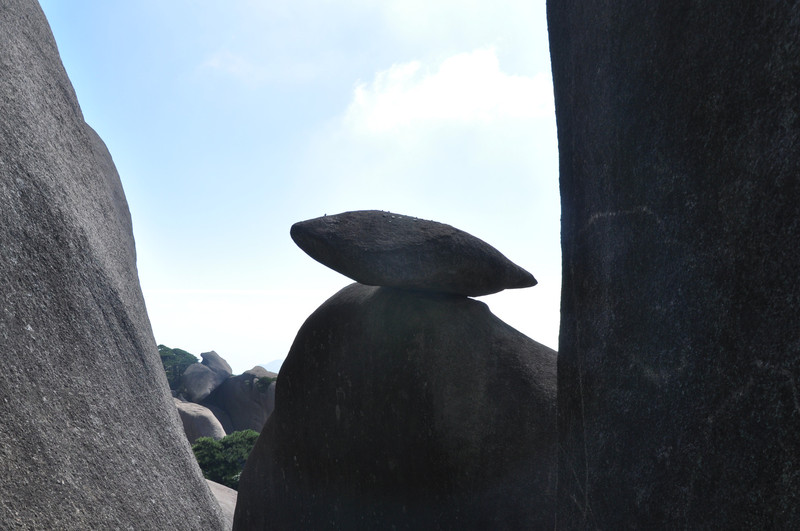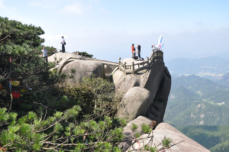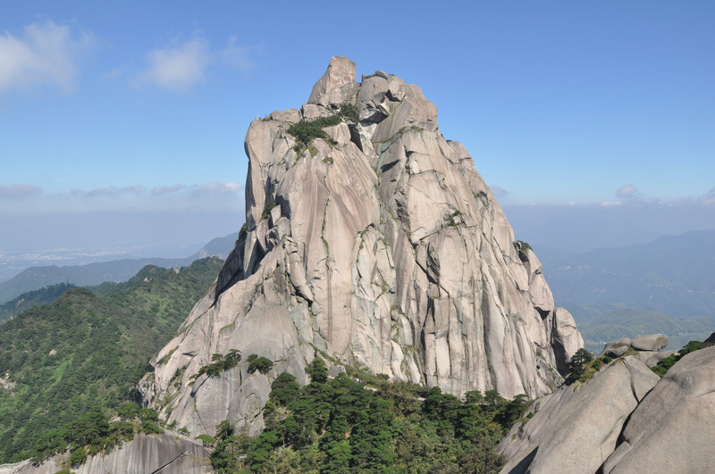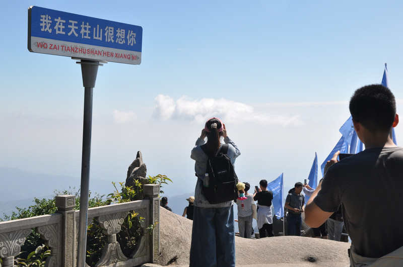 5.还有从大龙窝索道站上站出发上山,经捣衣岗、神秘谷、天池峰、观飞来峰、蓬莱峰,天柱峰是天柱山的主峰(海拔约1488米),天柱峰无法攀登,只能从远处观赏,不过全年约有一半时间天柱峰都隐没在云雾里,能否看到得看运气。走过“渡仙桥”两段一米长的石条,可登上天池峰顶,这里是观赏天柱峰的较佳位置,天气晴朗时这里视野宽阔,还是观日出、云海、晚霞的较佳地点。从天池峰往下经拜岳台岔口去一线天。返回时若时间充裕、体力好(团队一般从这里就原路返回),可继续走新游线,即接着下拜岳台,然后经搁笔台-仙人洞-青龙背-青龙轩-莲花峰,至炼丹湖向下,在这里可以左转350m坐牧羊河索道下山或向右1600m走画眉岭-迎真峰-丹砂亭-天柱山庄线路下山。如果有两天的时间且体力不错,可选择在天柱山庄住宿,第二天游览东关。