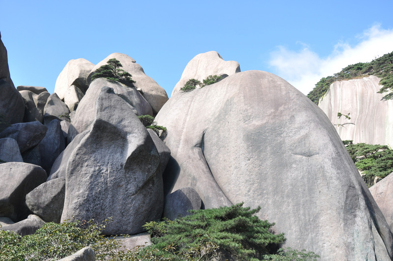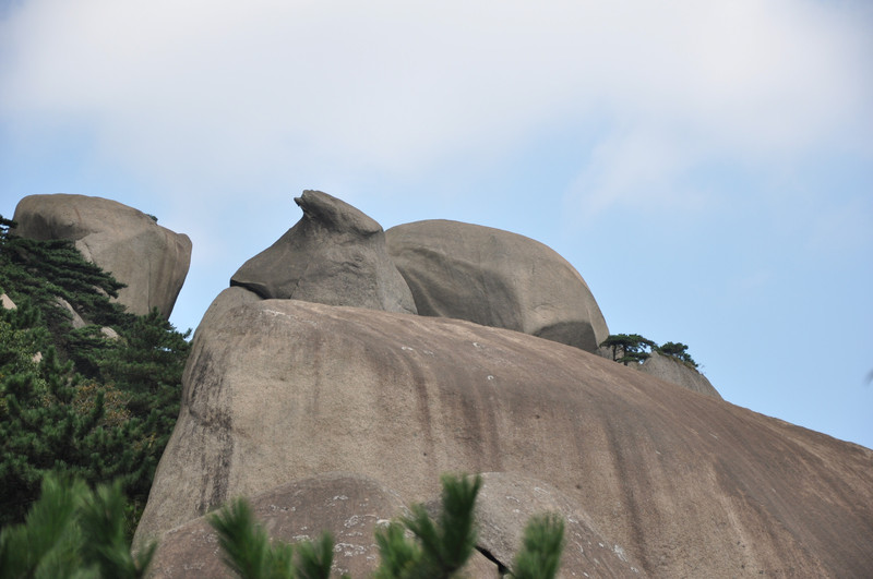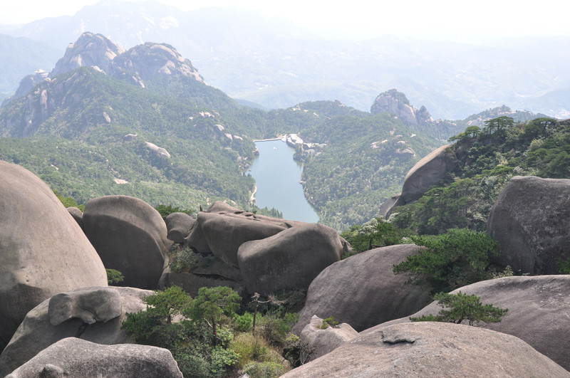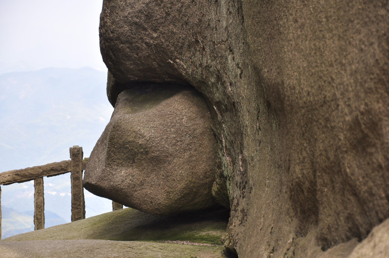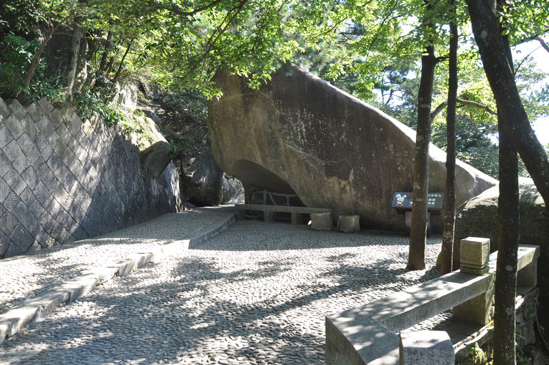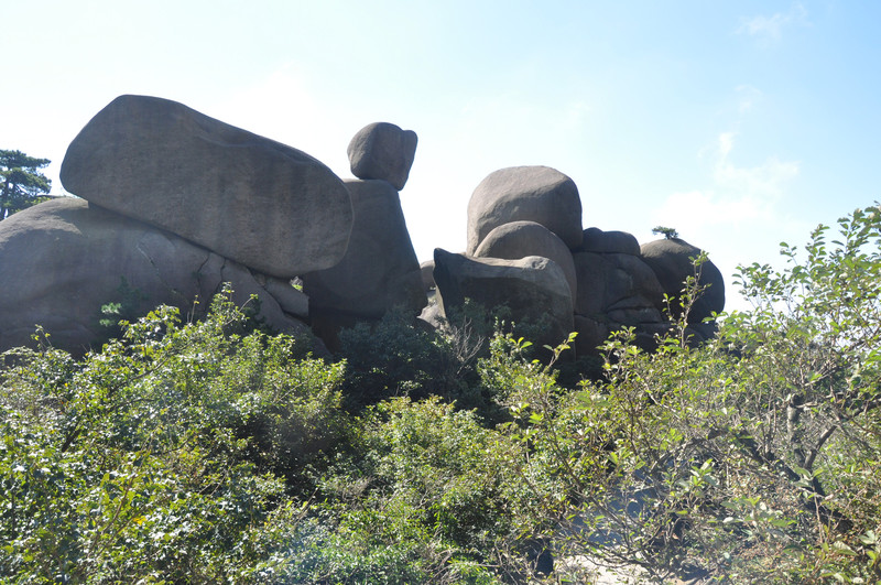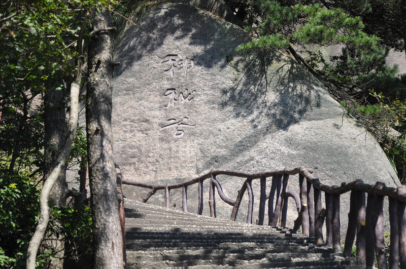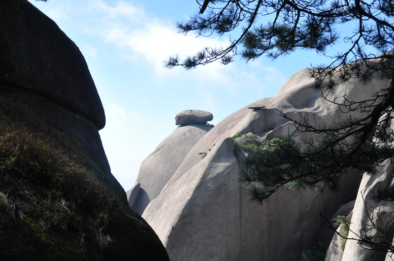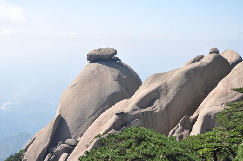5.还有从大龙窝索道站上站出发上山,经捣衣岗、神秘谷、天池峰、观飞来峰、蓬莱峰,天柱峰是天柱山的主峰(海拔约1488米),天柱峰无法攀登,只能从远处观赏,不过全年约有一半时间天柱峰都隐没在云雾里,能否看到得看运气。走过“渡仙桥”两段一米长的石条,可登上天池峰顶,这里是观赏天柱峰的较佳位置,天气晴朗时这里视野宽阔,还是观日出、云海、晚霞的较佳地点。从天池峰往下经拜岳台岔口去一线天。返回时若时间充裕、体力好(团队一般从这里就原路返回),可继续走新游线,即接着下拜岳台,然后经搁笔台-仙人洞-青龙背-青龙轩-莲花峰,至炼丹湖向下,在这里可以左转350m坐牧羊河索道下山或向右1600m走画眉岭-迎真峰-丹砂亭-天柱山庄线路下山。如果有两天的时间且体力不错,可选择在天柱山庄住宿,第二天游览东关。