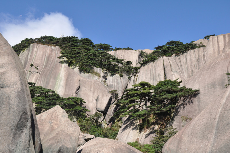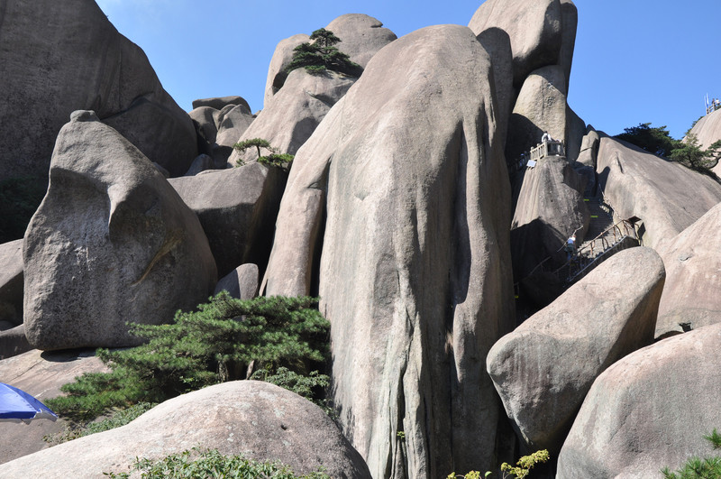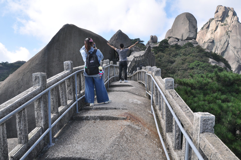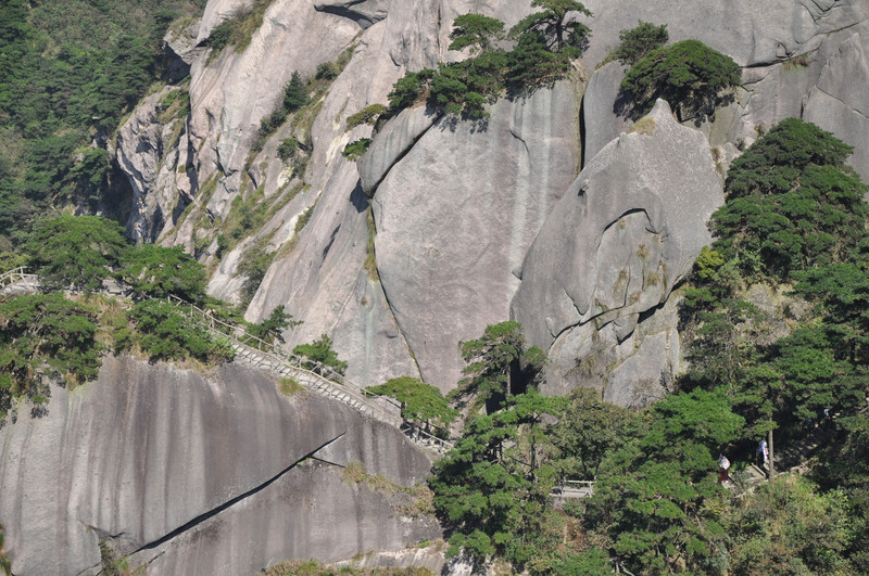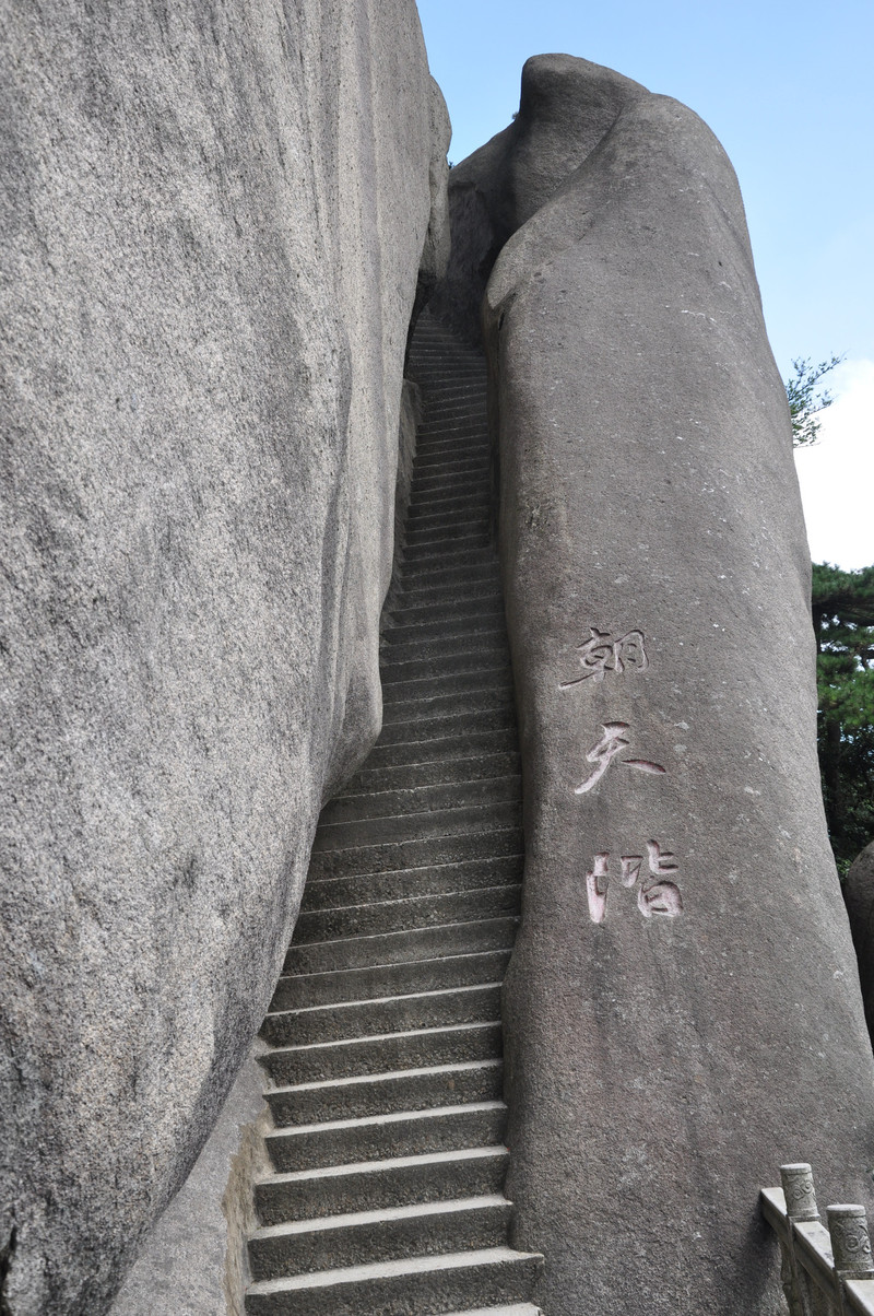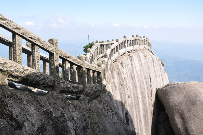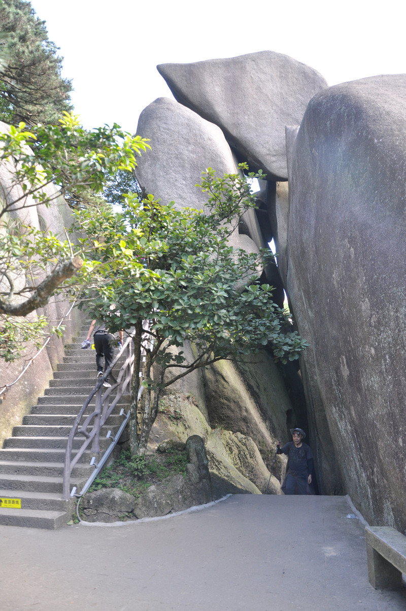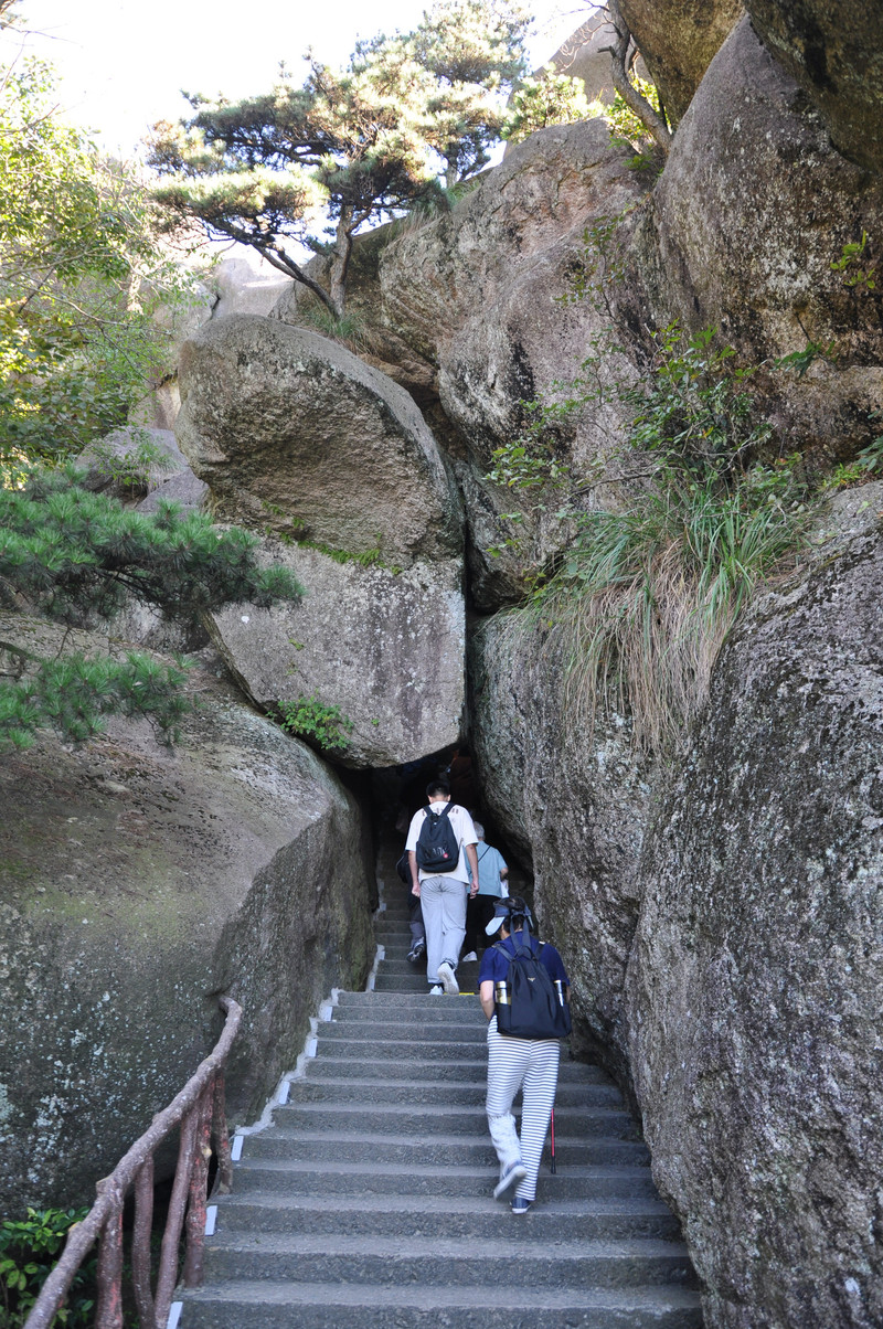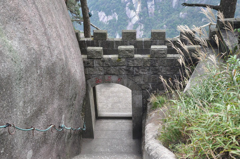 7.俗话说“东关险、西关秀”,东关线路的攀登难度要大于西关,路上会有更多直接在光秃秃的巨石上凿出来的台阶,而一侧往往是深不见底的悬崖,走起来要格外小心,而且对于体力也尤为挑战(东关的路线是:仙桃石-画眉岭-回音台-千丈崖-大天门-鹊桥-奇谷天梯-东大门)。大天门是两座山峰中间的峡谷,一条狭长陡峭的石阶挺拔通天,气势磅礴,是走东关耗体力的一段路。大天门之后的鹊桥更为险峻,一侧是峭壁,另一边是万丈深渊,虽然有铁栏杆围护,但行走仍需十分谨慎。奇谷天梯更以陡和窄著称,也有些“一线天”的意思,有些地方只能手脚并用才能通过。