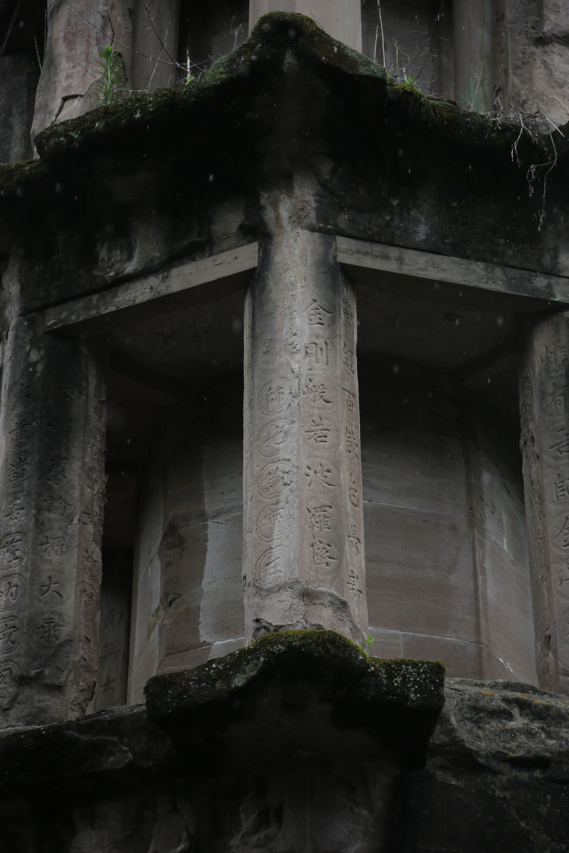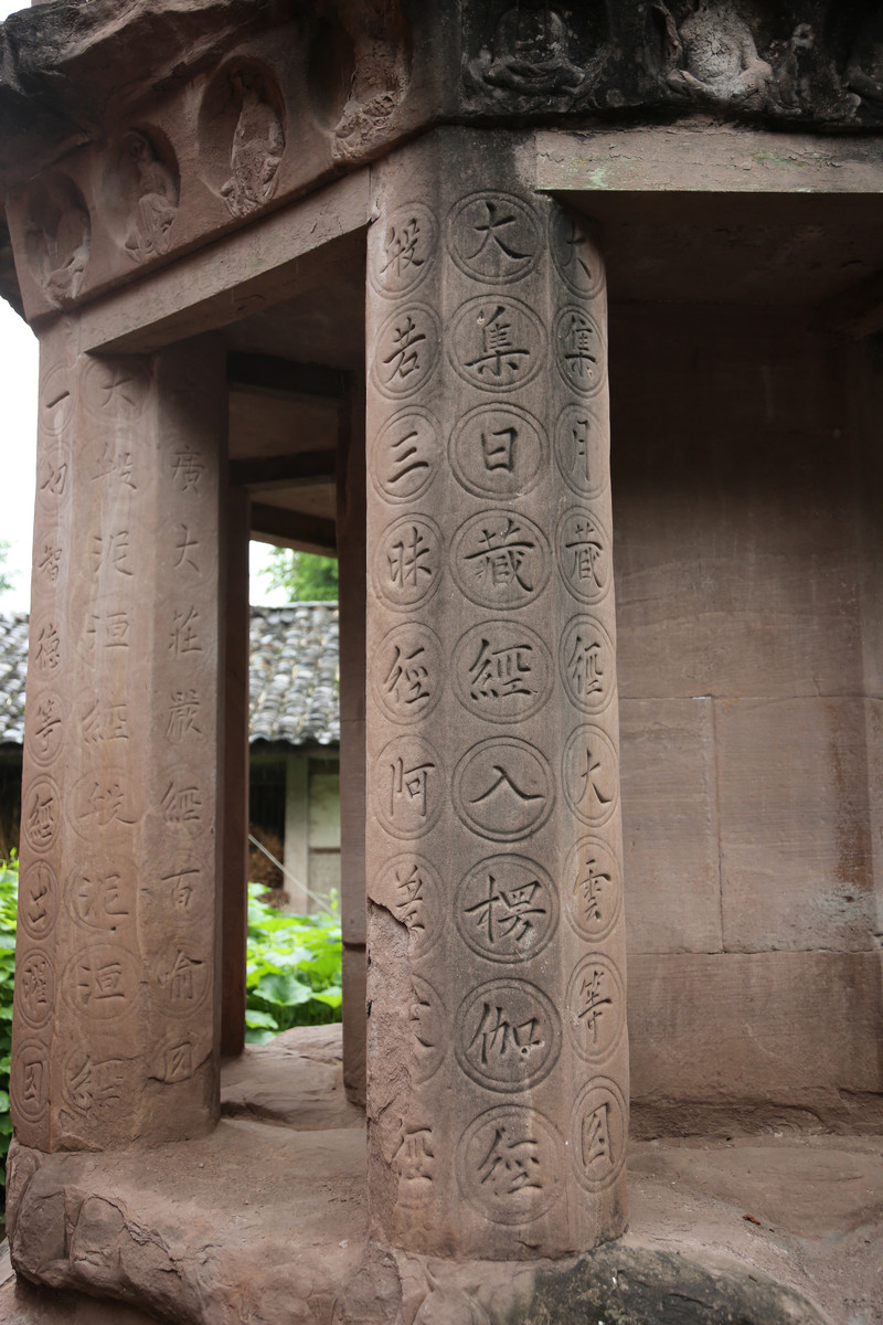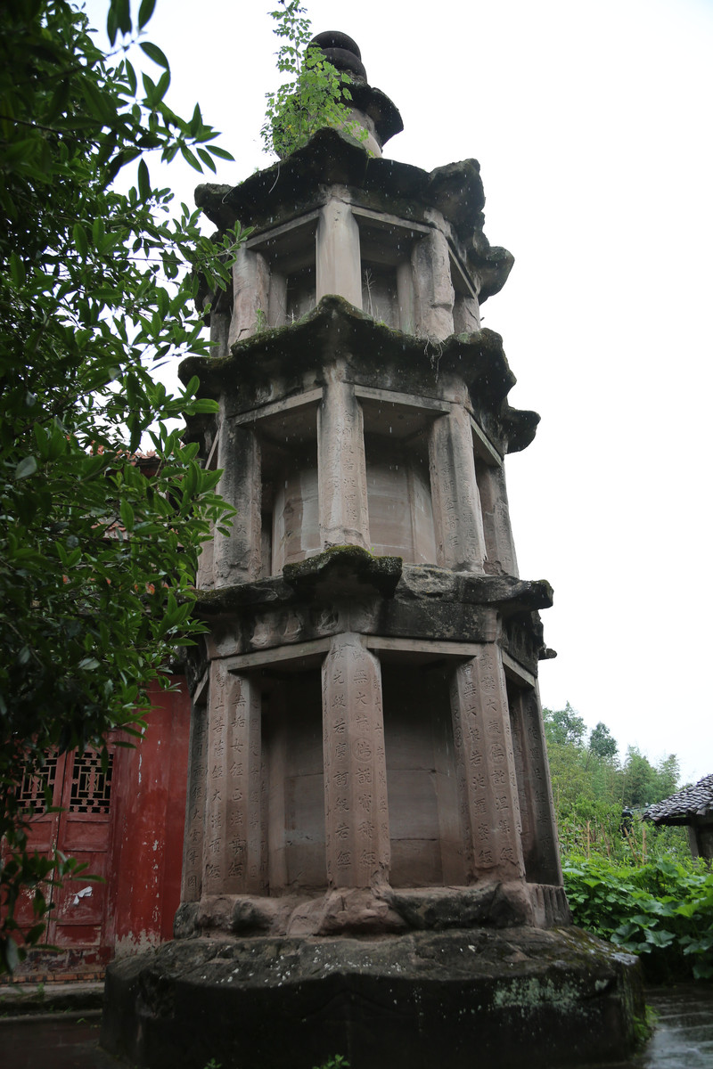 此外,孔雀洞后山顶上还有一座唐代高台座经目石塔,高15米,8方3层,浮雕小佛像24尊,该塔古朴秀丽,保护完好,在四川省石塔中属罕见。这座经目塔每层的八根立柱上刻满佛经名录,共144部,因此得名经目塔。塔上刻有“真身舍利塔”的字样,且每层塔檐下还刻有坐佛,每面四尊,全塔共120尊,但很多已经风化或损坏。