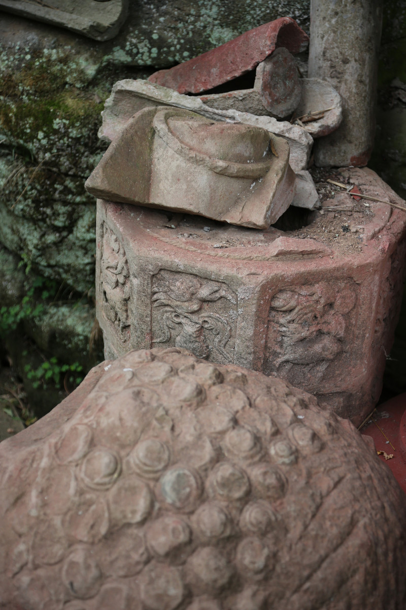 原来这里还有其他造像龛,特殊年代都被破坏了,洞外的地上还散落着一些佛头和构件。