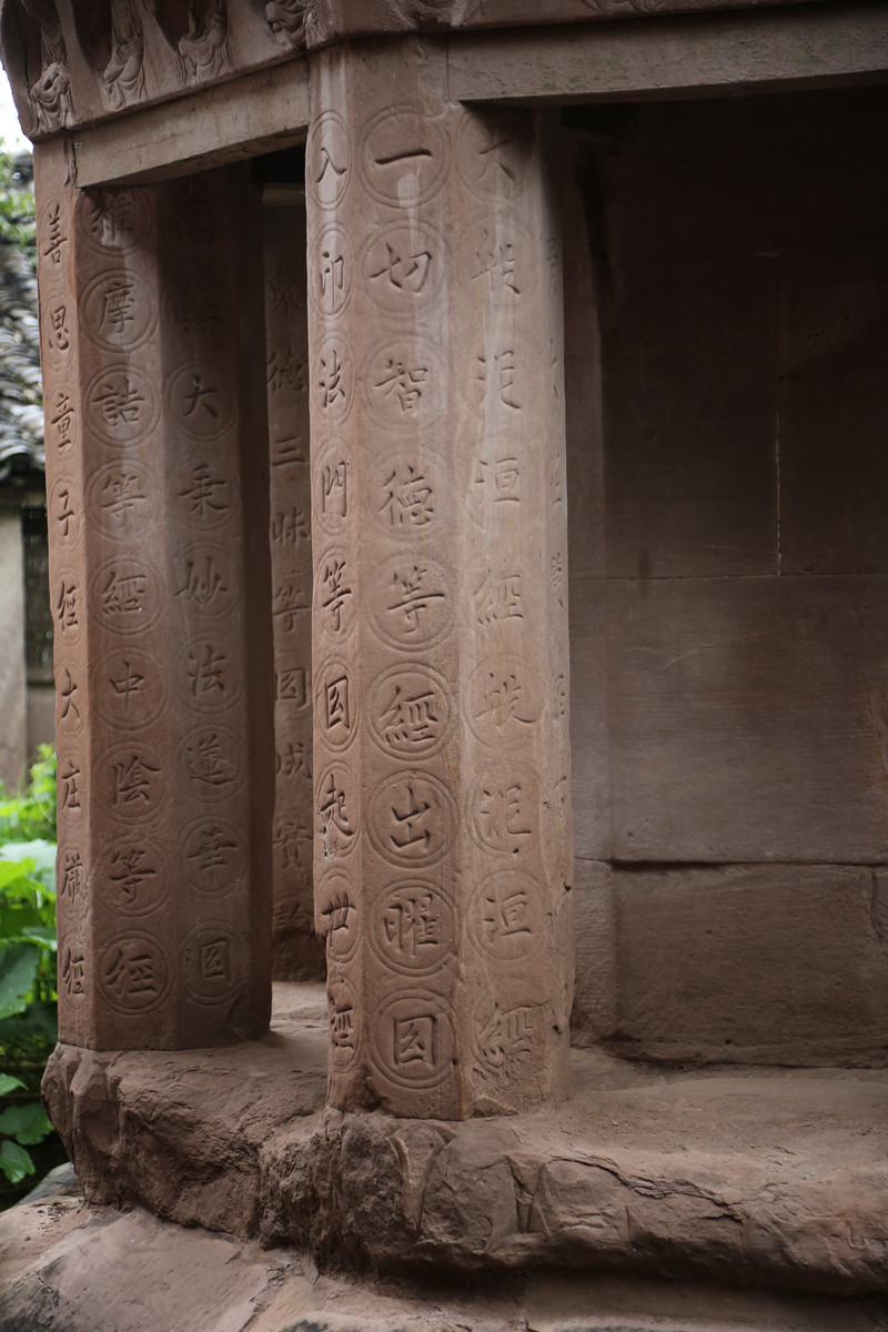 塔为八面三层楼阁式,红砂岩质。每层的八根立柱上刻满佛经名录,共144部,因此叫经目塔。老师说塔上光一个“经”字有五种写法,发了张图片到群里,结果大家就围塔认真找寻起来。