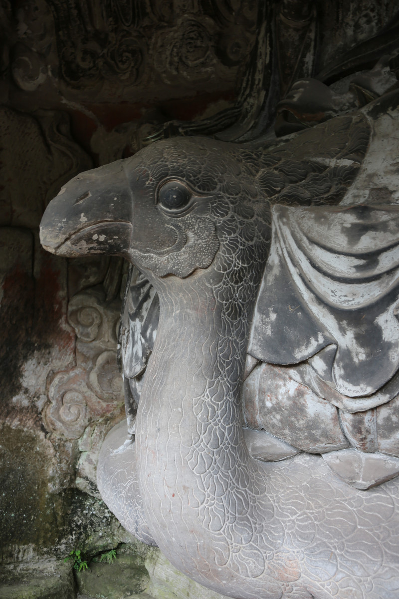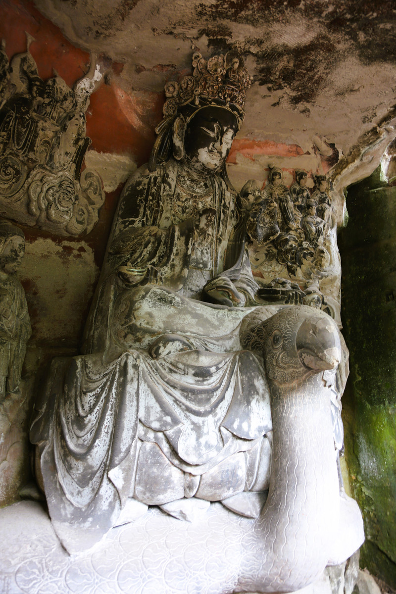佛家经典里,大孔雀明王是“舍除暴恶,咸起慈心”的菩萨。据传安岳县双龙街乡古代曾有成群的孔雀栖息,故称孔雀场,而这里也是密宗孔雀明王的道场。孔雀破壁而出,双目炯炯有神。巨大厚实的双翅驮起双目微闭、面容慈祥的明王。而这身明王并不像其他明王一样狰狞忿怒。