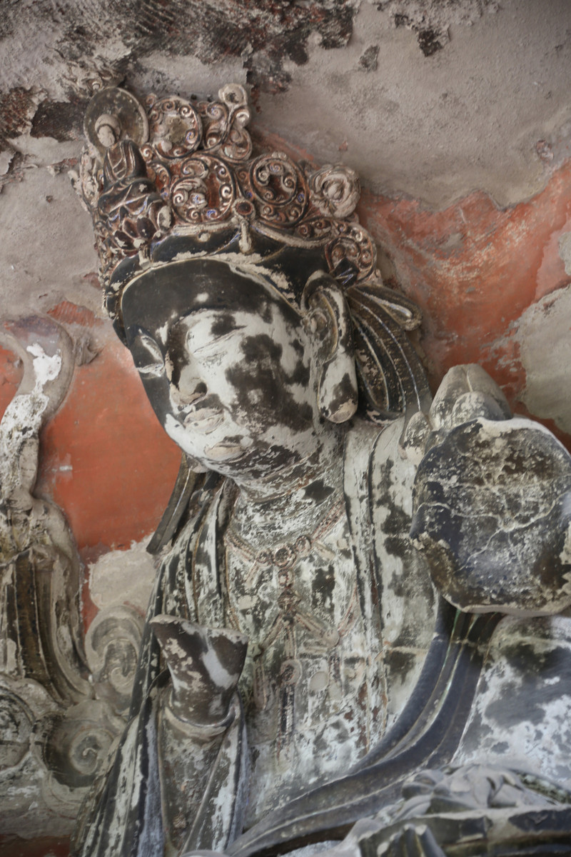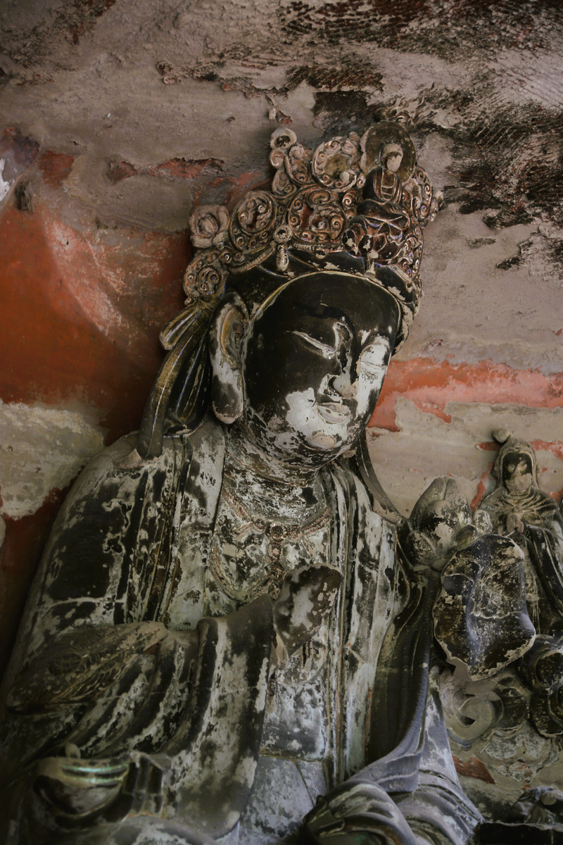 她结跏趺坐于莲台,头戴十连云花宝冠,冠上有化佛。造像脸部身上的黑色,有说是早年百姓在这里生火做饭烟熏火燎染成的,也有说是颜料氧化形成的。但斑驳的色彩似乎并不影响菩萨的圆润丰美,她双眉细长,双目下垂,珠饰繁复,雍容华贵又和蔼近人。
