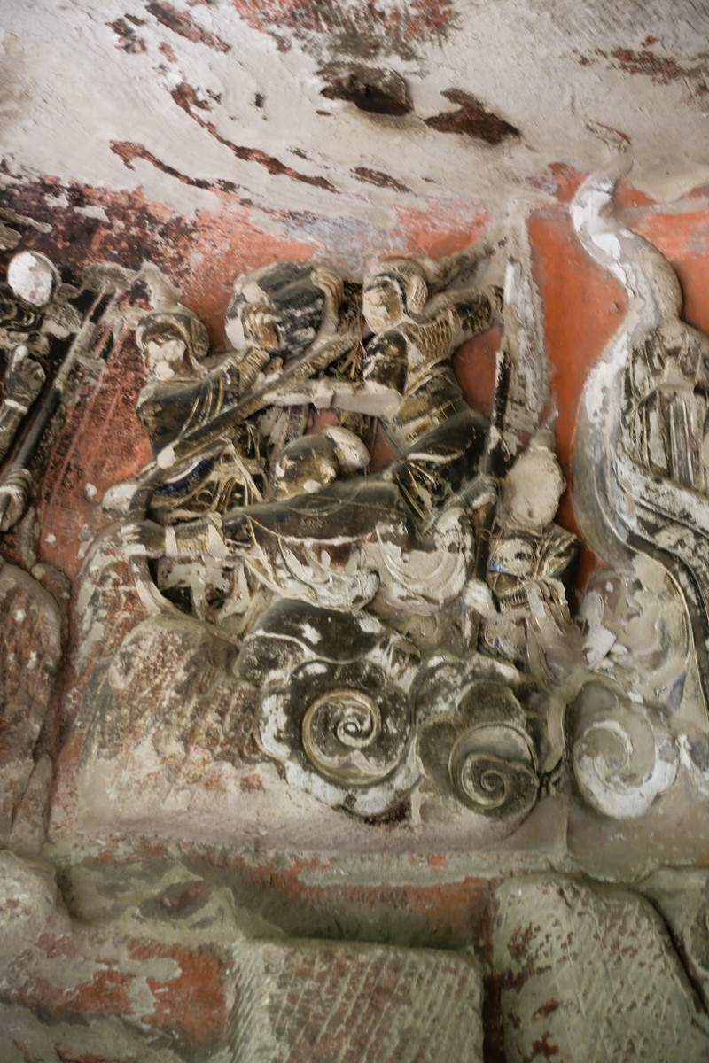 两侧面的崖壁上,雕刻了天众大战阿修罗的场景: