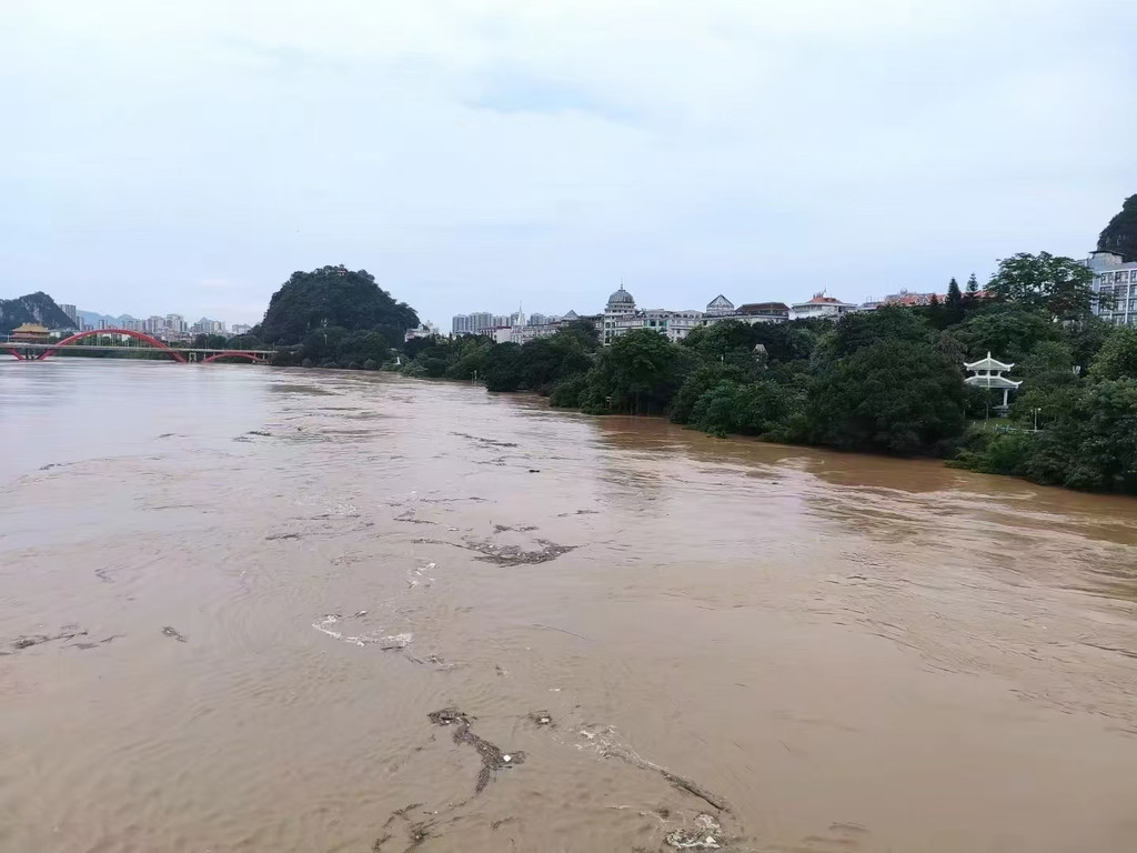 暴雨过后洪水漫上河堤时的柳江