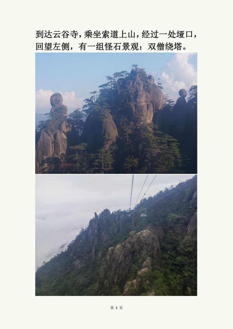 - 一日游线路:从新国线换乘中心坐景区大巴到云谷寺缆车下站,乘云谷索道上山,游览竖琴送、始信峰、连理松、黑虎松、梦笔生花、排云亭、飞来石、群峰顶、光明顶等,最后乘玉屏索道下山。