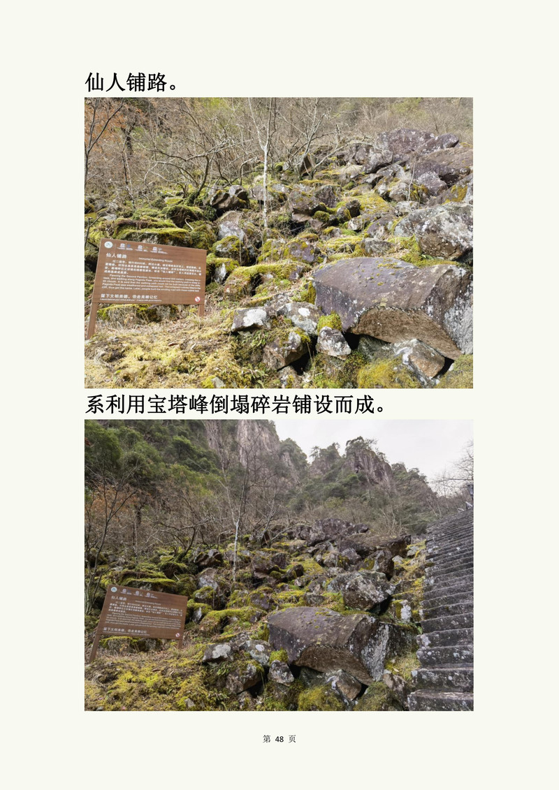 - 飞来石:位于平天矼西端,高12米、重600吨的巨石,底部和山峰豁然分开,似天外飞来。