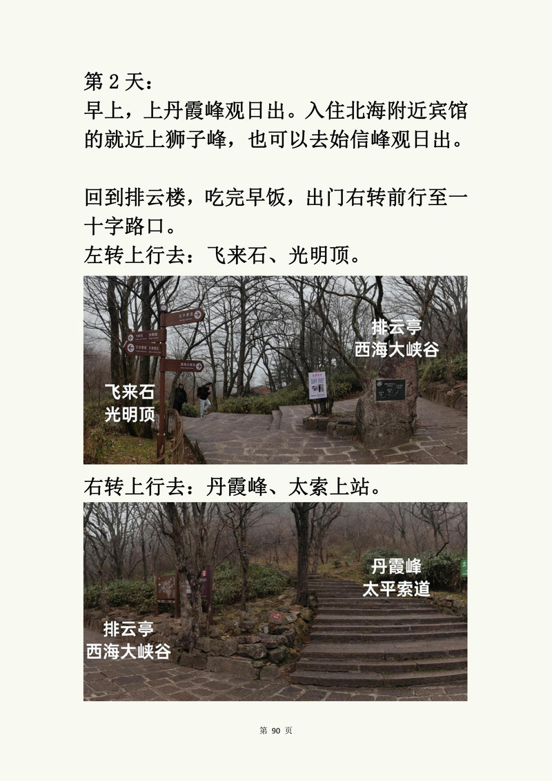 - 后山路线:云谷寺 -> 白鹅岭 -> 始信峰 -> 狮子峰 -> 光明顶
