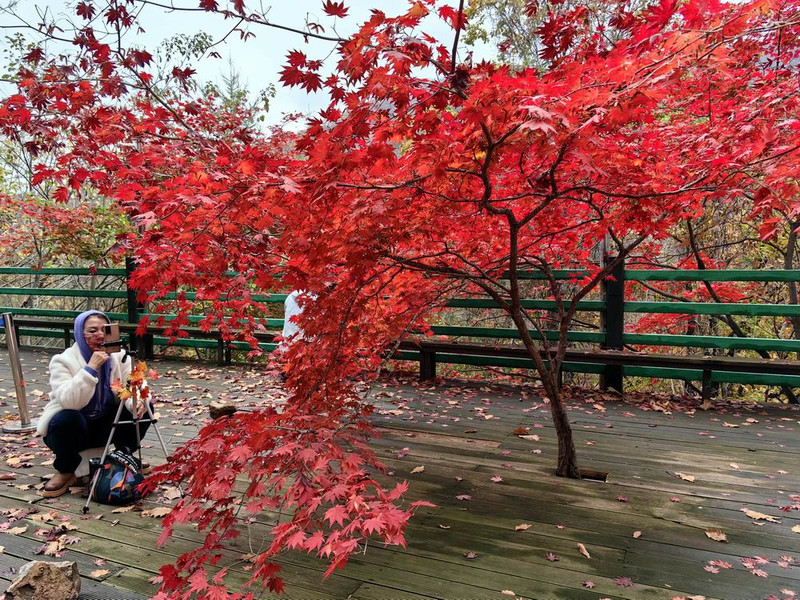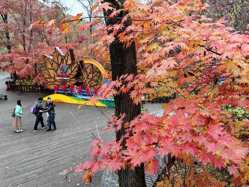 时至深秋,园内13种枫树由于生理特性的差异,形成颜色深浅不一交相辉映的梦幻景色,大红、火红、深红、浅红、紫红、橘红等,囊括了所有的红色枫叶染遍枫林谷,颜色格外艳丽,山谷的色彩达到了巅峰,形成了一幅幅自然风景画。照片摄于枫林谷景区。