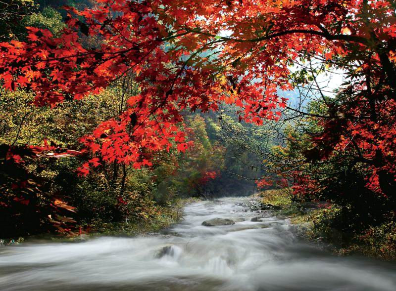 - 秋天的枫林谷山峦起伏、溪流纵横,枫叶由绿转黄,由黄渐橙,由橙变红,由红而紫,五彩斑斓,构成了一幅绝美的画卷。