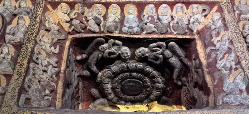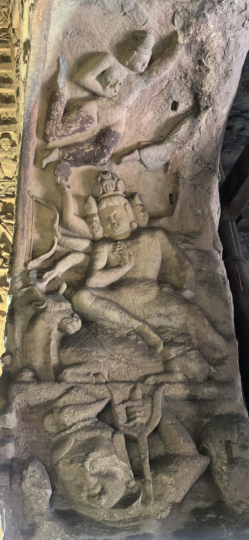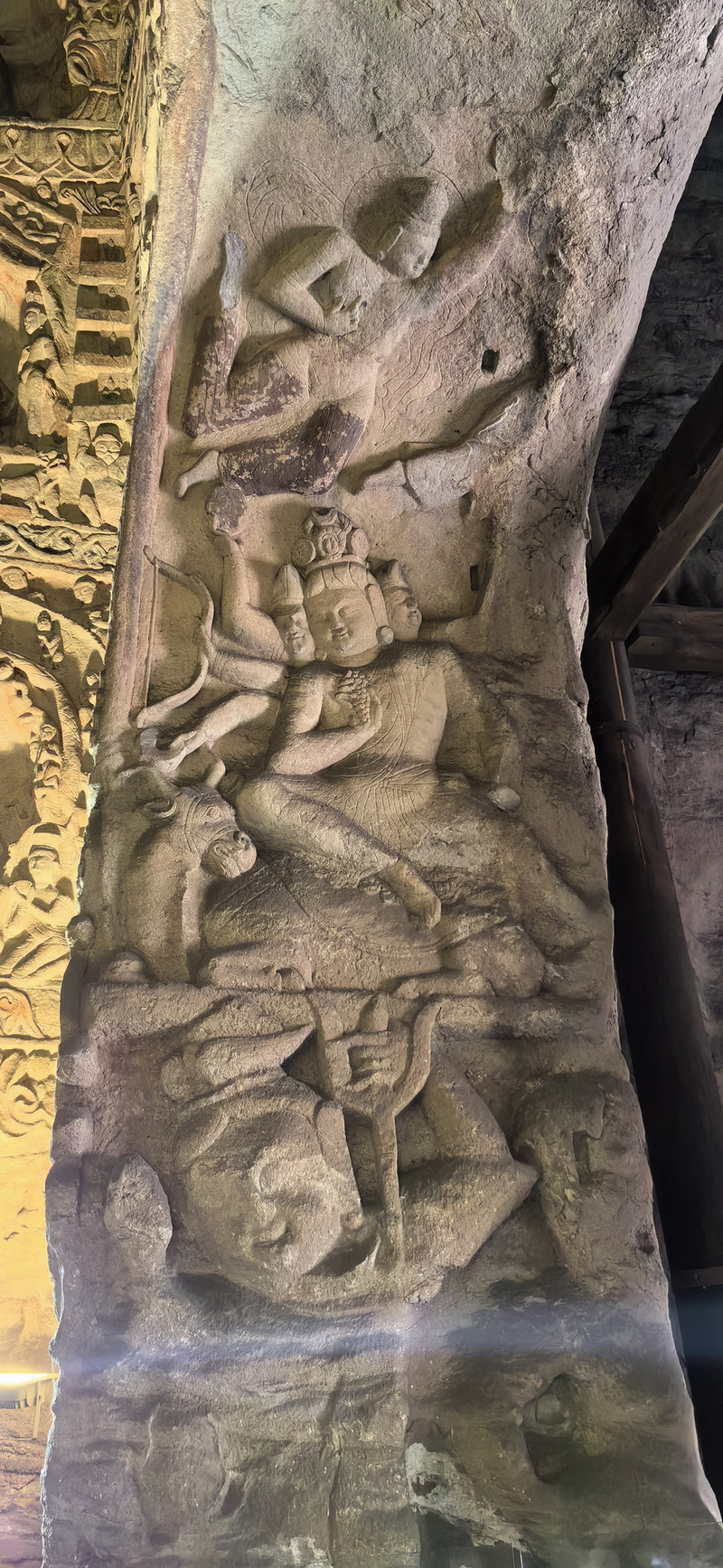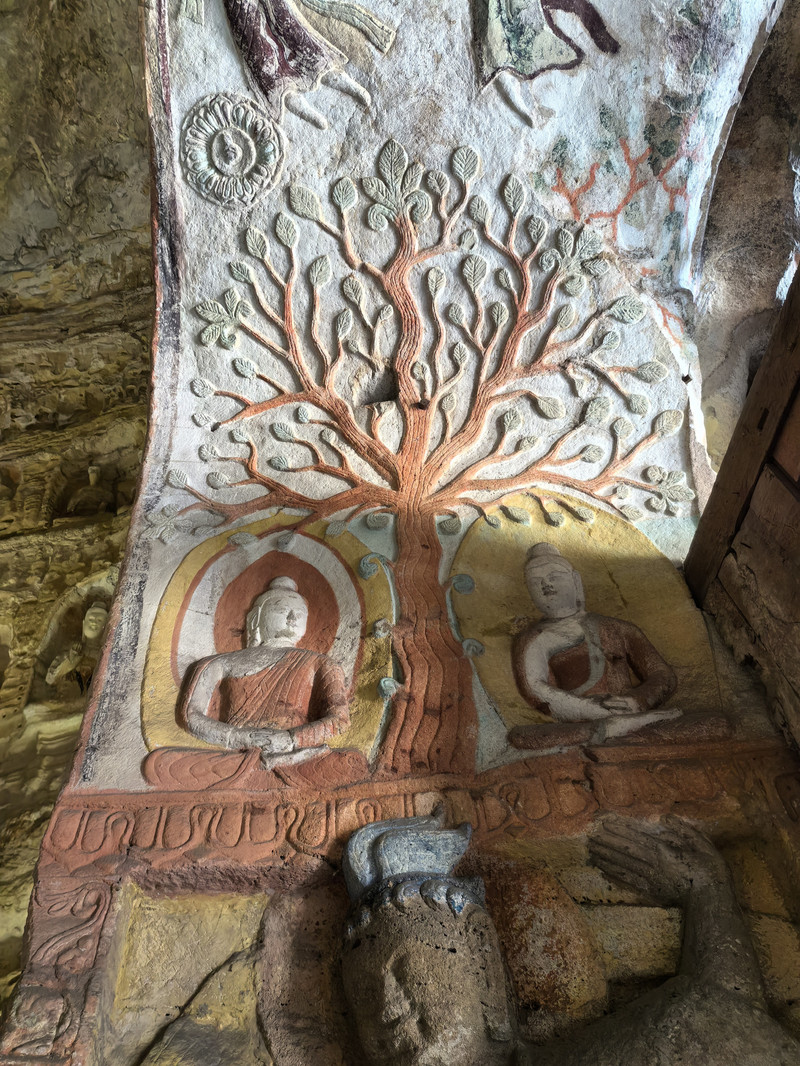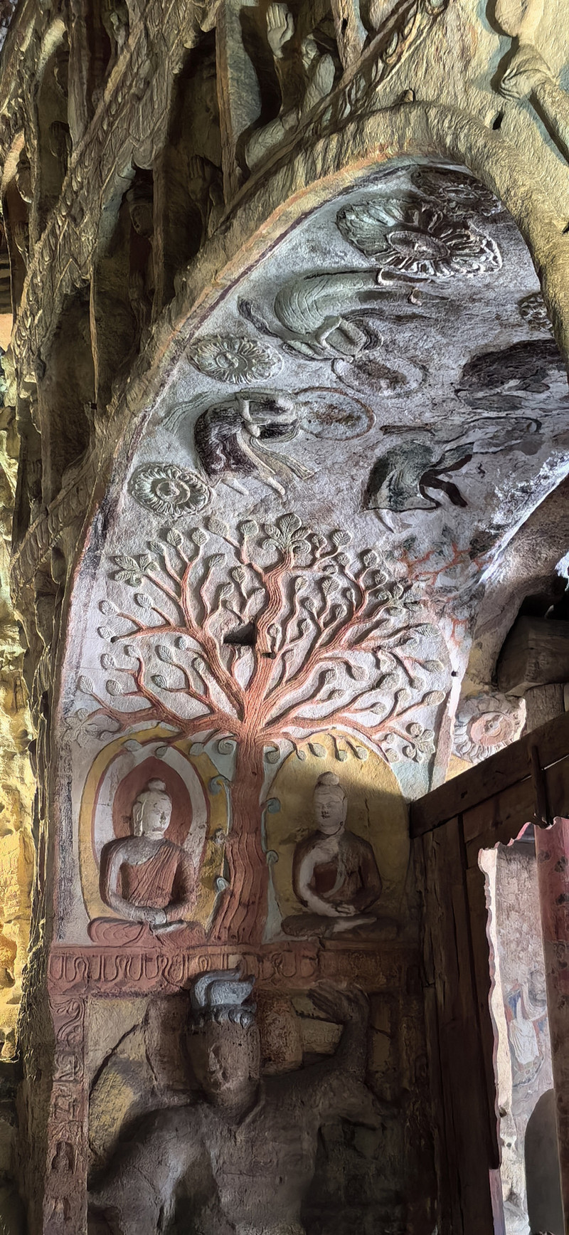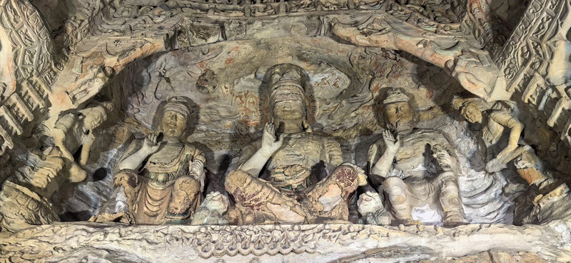 第10窟(毗卢佛洞):前室北壁明窗与拱门之间,须弥山层峦叠嶂,山腰二龙交缠,山间有茂密的林木和竞奔的动物。外侧,阿修罗天单腿盘坐,多头多臂,手托日月。东西两壁各雕三间式屋形龛,龛内佛像面相慈和,菩萨神情恬静。阎浮树下,半跏坐思惟菩萨,一手支颐,沉于四谛。窟门东西两侧金刚力士,头戴鸟羽冠,手持金刚杵,表情和善。后室主像为弥勒菩萨,东西两壁各一胁侍菩萨。南壁为表现释迦因施善教、降服外道的因缘故事龛。