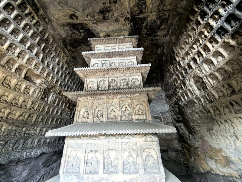 第2窟(寒泉洞):该窟地下有泉水涌出,故名寒泉洞。窟内三级方塔居中,塔面上刻出瓦筒、檐椽、斗拱等仿木建筑构件,上层四角镂刻八角柱;四壁分层分段布局,最上层雕刻天宫伎乐列龛,下面依次为锯齿纹垂幔带、禅定坐佛带、大型列龛、长卷式浮雕故事,最下层为供养人列像;北壁主像为释迦坐佛,风化严重;东壁下层浮雕太子“箭射铁鼓”佛传故事;窟外壁明窗上方及西侧题刻“山水有清音”、“云深处”。
