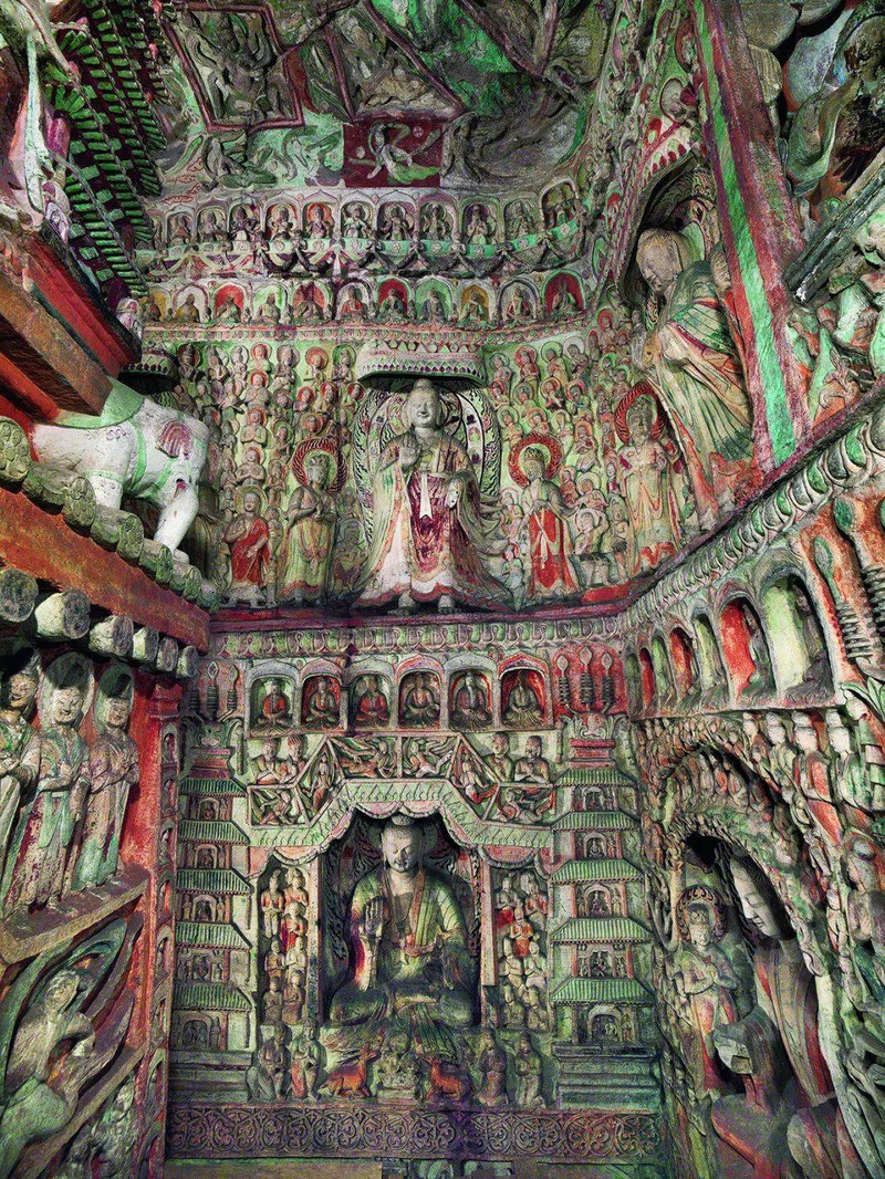 第13窟(文殊菩萨洞):穹窿窟顶,主像为交脚弥勒菩萨,高13米,头戴宝冠,颈部戴悬铃项圈及璎珞,胸佩蛇饰,双首啣珠。右手臂肘下,一力士四臂奋力托举,势若拔山。该像经后代包泥彩绘,原雕仅见双足踏莲。东壁龛像,殿堂飞阁,流苏帷帐,神龙跃动,尽显汉风。南壁明窗与窟门之间屋形大龛内,七立佛造像气韵高雅。