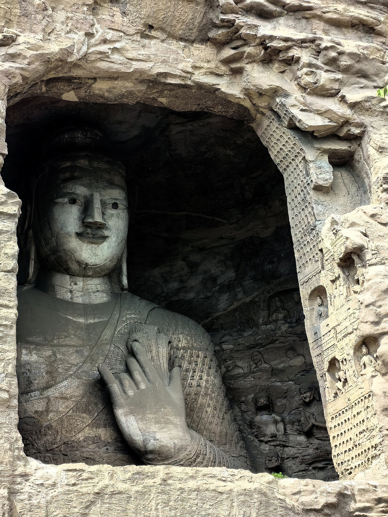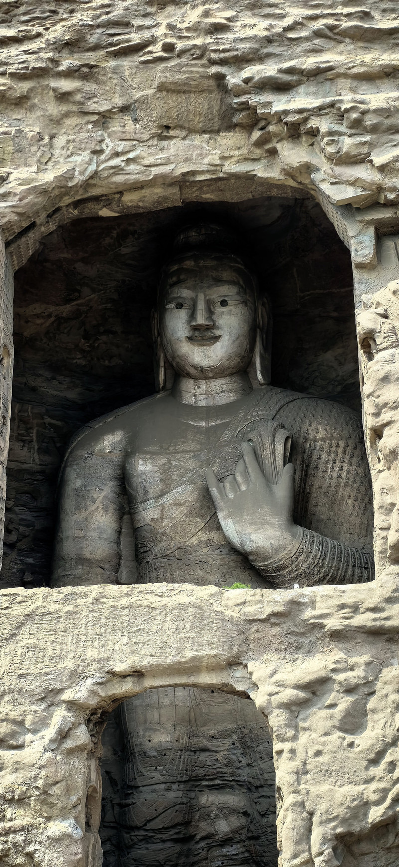 第16窟(立佛洞):主像为释迦立佛,高13. 5米,波纹状发髻,清秀俊逸。佛像身穿褒衣博带式袈裟,胸前结带下垂,属北魏太和年间推行汉化时的服制。