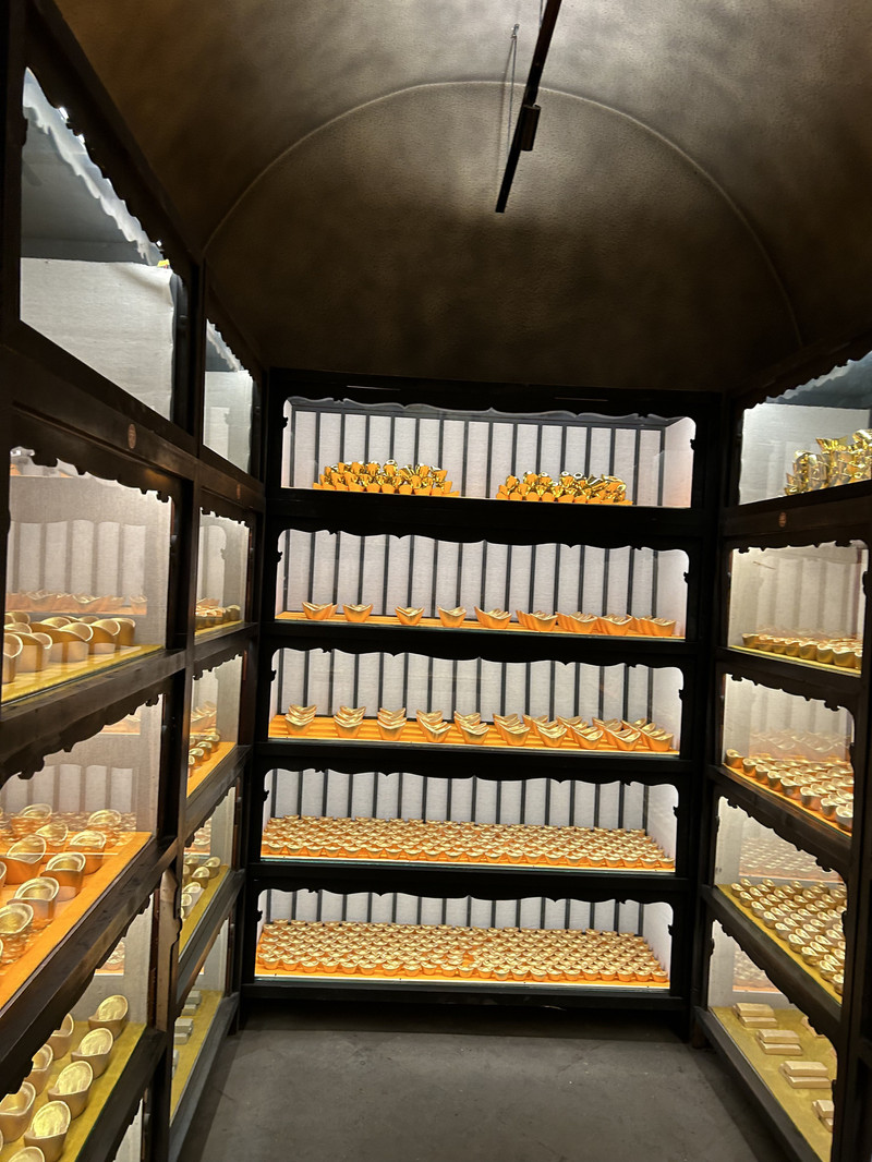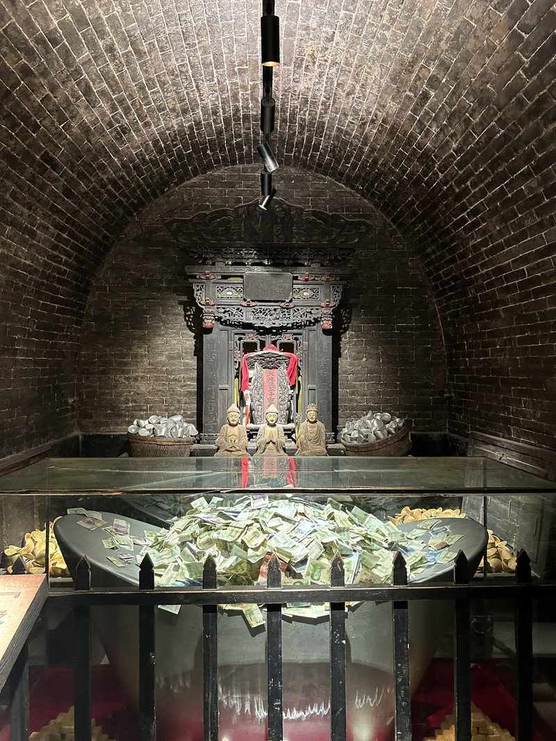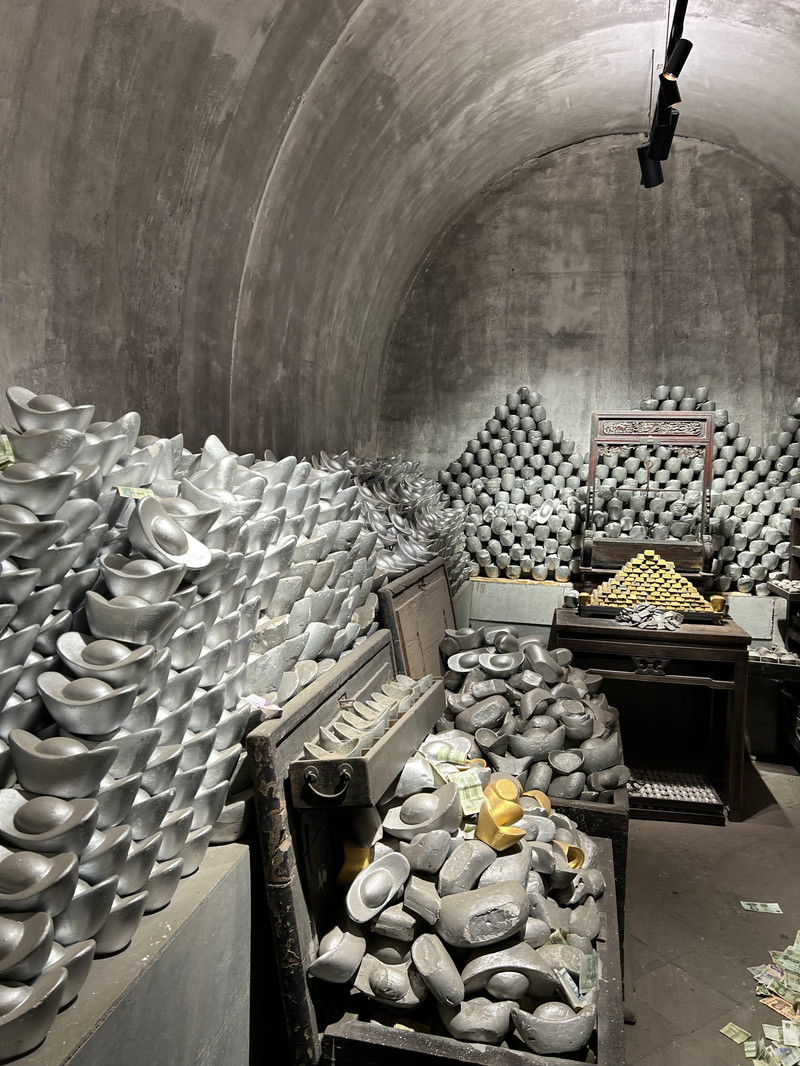 经过几处转弯,出现了一条地下石阶;两旁点缀着微弱油灯,光影在石壁上摇曳生姿,随后一睹雕刻财神的墙壁赫然闪现。财神墙正对面的区域,就是我们心心念念的地下金库。此时让我用一组炸裂的照片,让小伙伴们切实感受金库的风采!
