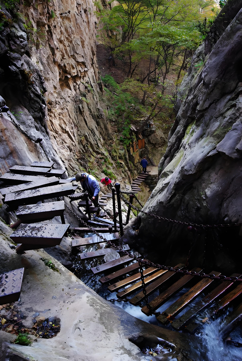 沿着蜿蜒的栈道前行,那真的是一步一风景。栈道两旁峭壁如削,古木参天、遮天蔽日,形成了一道道天然屏障,感叹于大自然的鬼斧神工。继续向前行走,道路会变得狭窄,仅容一人通过,我俩顿时心跳加速。