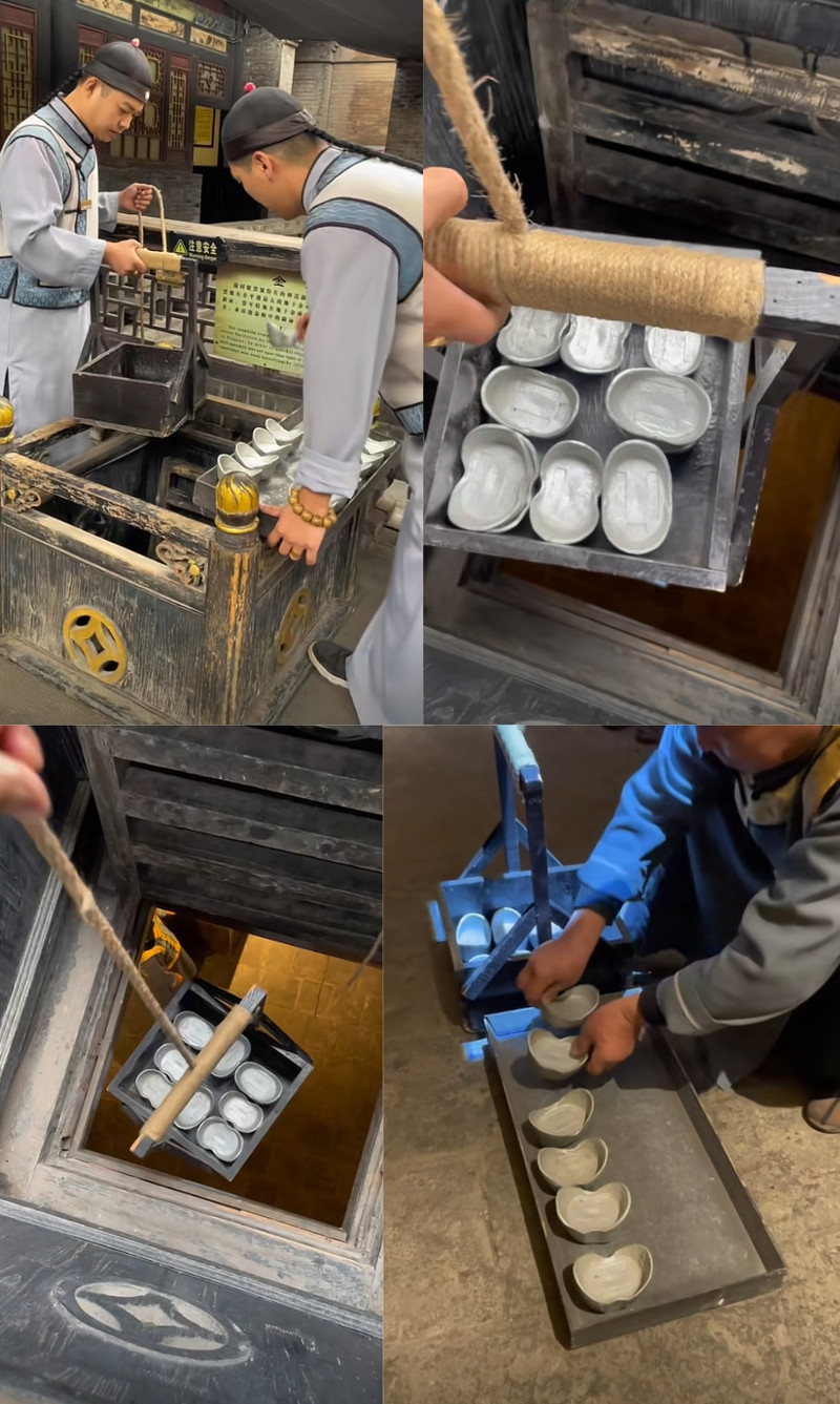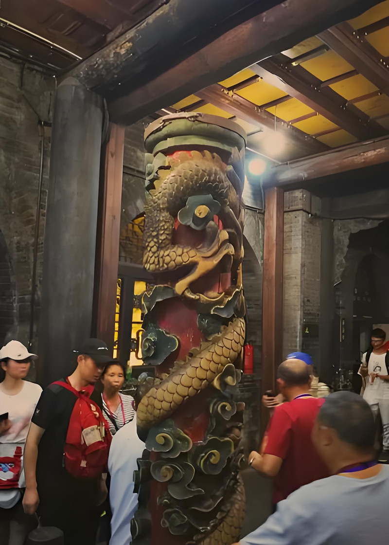 有客户前来兑钱时,上下两名伙计密切配合,通过不断升降两个竹篮子,以此实现银两、黄金的提取。现如今常说的“提现”,就是这样演变而来的。地下金库的另外一大惊喜,则是栩栩如生的神龙宝柱。