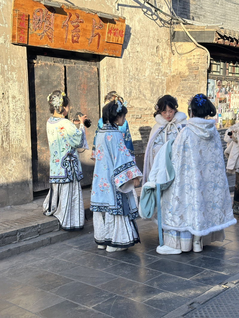 阳光透过云层洒在斑驳青石板路上,光影交错之间,好似能洞穿前朝痕迹。旅人脚步声、嘈杂交谈声,完美交织成悠扬市井小调,让人不禁沉醉。偶然一瞬,身披晋商少奶奶服装的女子轻盈而来,衣袂飘飘,如同古画中走出的美人,为庄严的明清古街道增添诗意浪漫。
