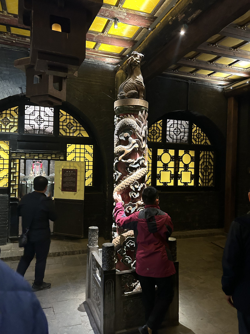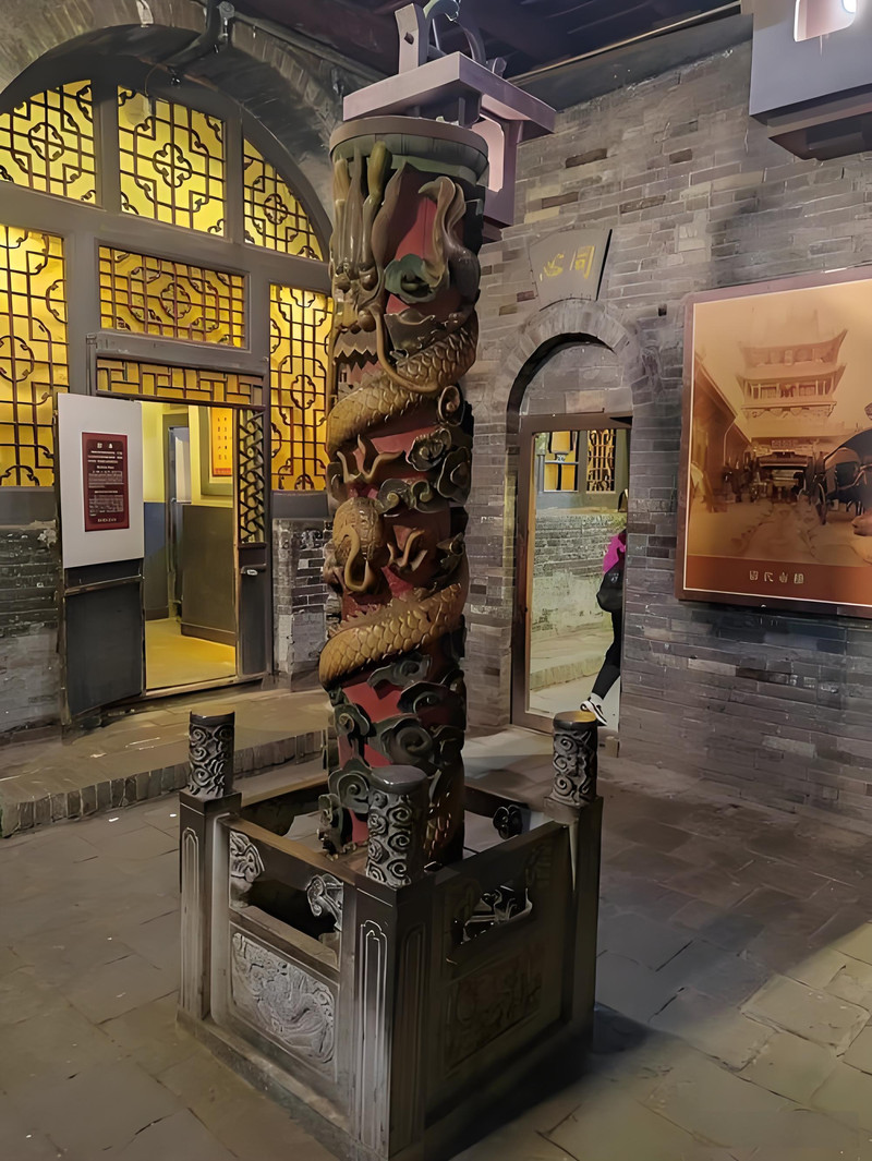 神龙柱位于金库正中央,以上等樟木精雕而成。柱身缠绕着威武霸气的神龙,龙眼炯炯有神,龙体矫健,仿佛下一刻就腾空而起。据传,神龙柱是平遥古城中心所在,被视作古城定海神针,抑或是风水柱。