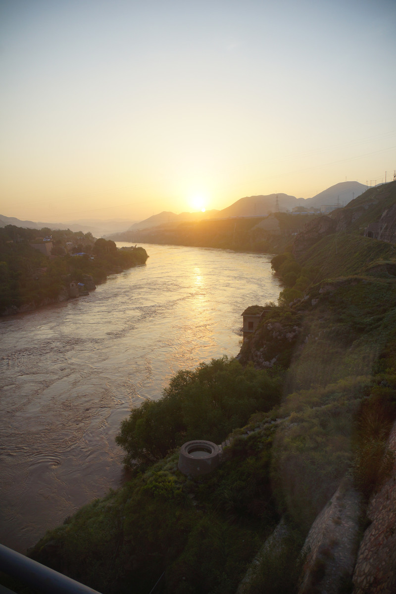 在北京去兰州的列车上,早上醒来,惊喜地发现在黄河上冉冉升起的太阳。