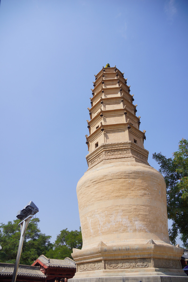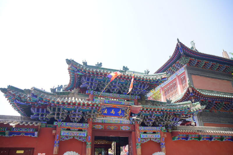 感觉还是走了一段路,看到了白塔,相传白塔寺为纪念元代为去蒙古谒见成吉思汗而圆寂于兰州的西藏著名喇嘛而建。白塔七级八面,下筑园基,上着绿顶,为实心砖塔;各面雕有佛像,每级每角均有翘起的砖刻小龙头,下系铜马铃,随风飘荡,声清音脆,塔外通涂白浆,如白玉砌成,故称白塔。