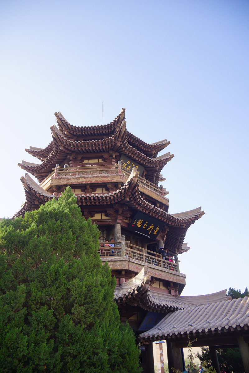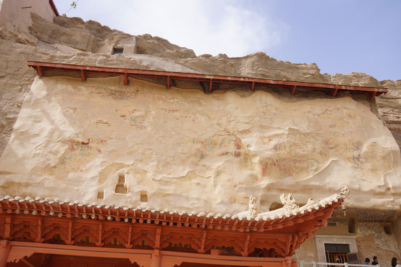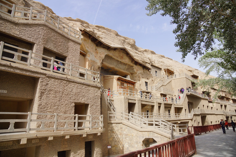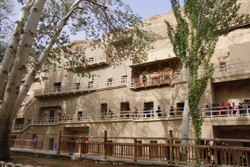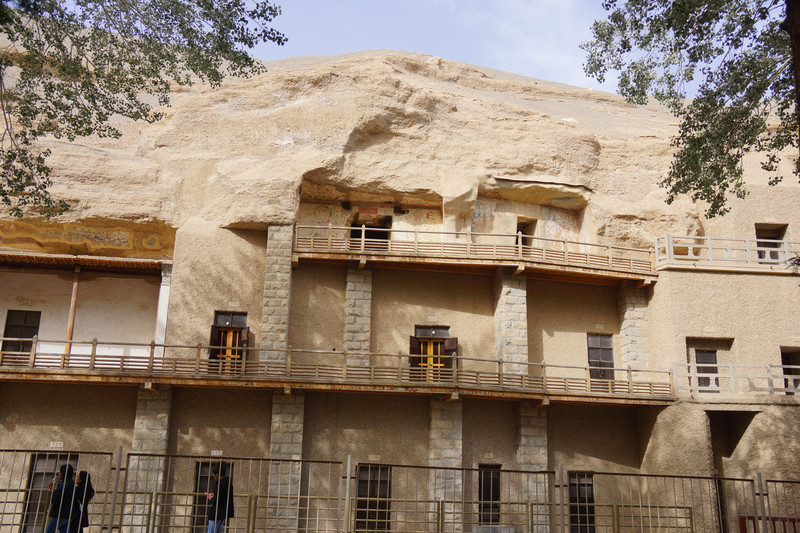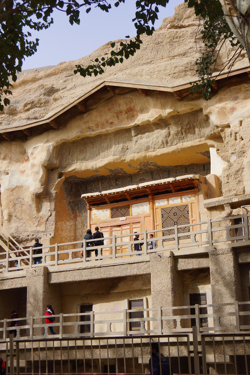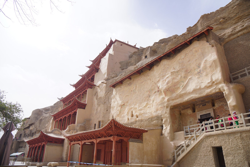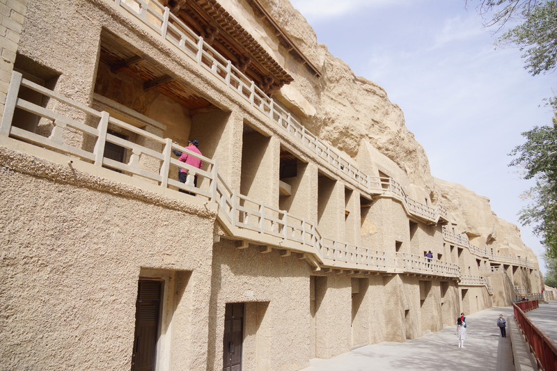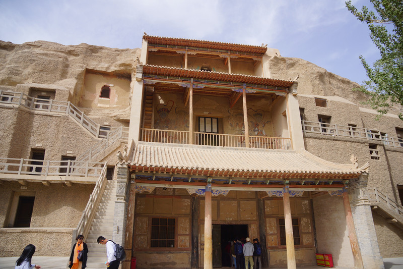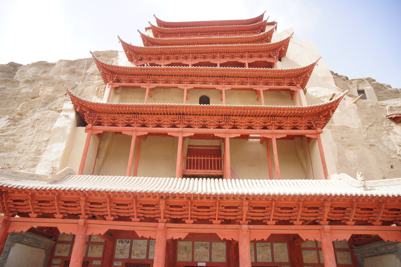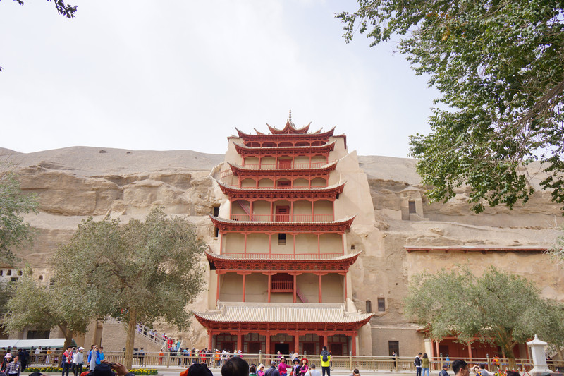 虽然每个导游带进的8个窟会不尽相同,但有几个著名的窟每个团队都是一样的(固定包含九层楼96号、藏经阁17号和卧佛窟158号)。在整个莫高窟,基本都是沿山壁开凿的原始洞窟,唯独在北面有一个九层楼的建筑,显得有些突兀,是莫高窟的标志性建筑。它就是编号为96号的洞窟,我们今天第一参观的就是这个窟。