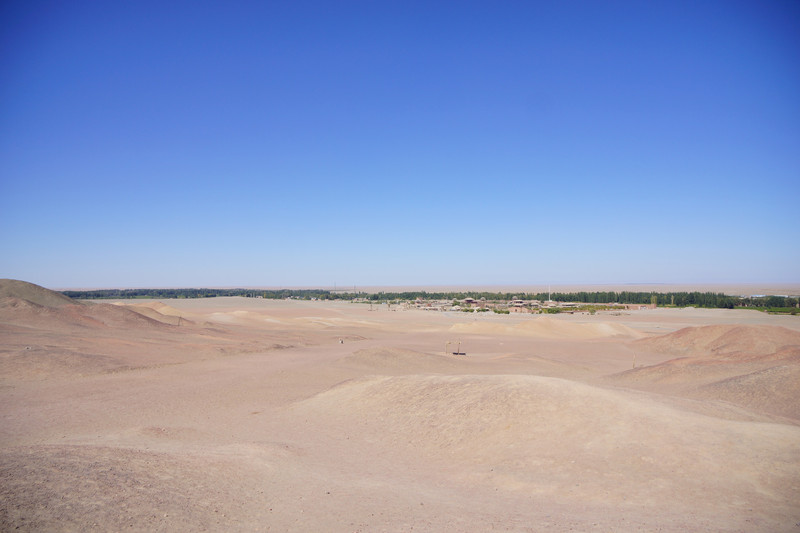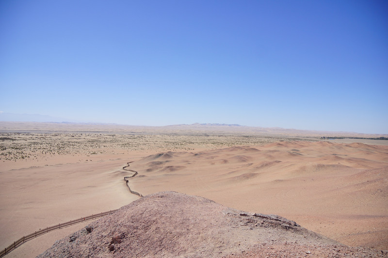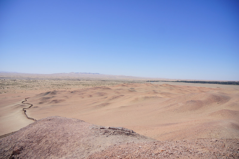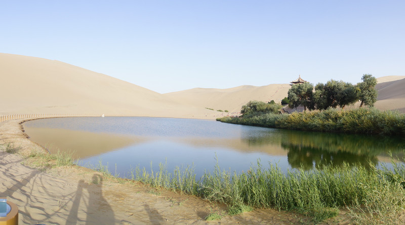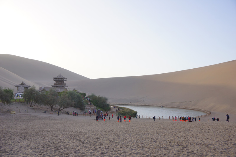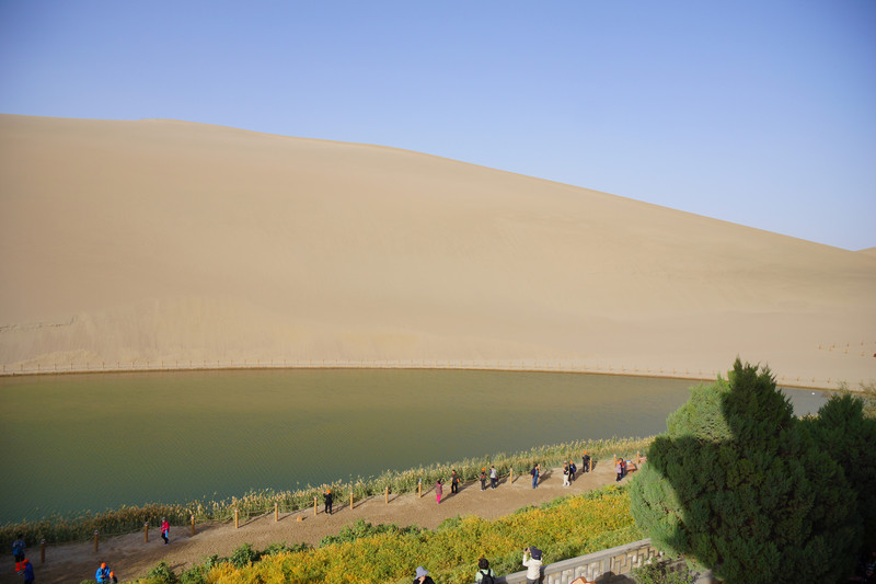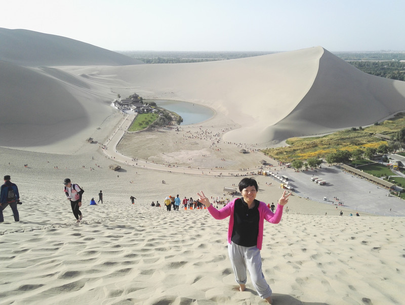 登到高处,月牙泉处于鸣沙山环抱之中,尽收眼底。