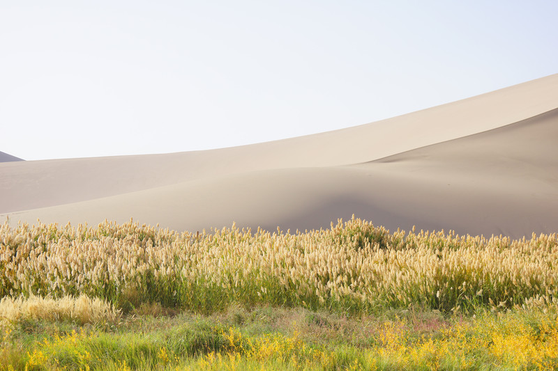 鸣沙山有流沙积聚而成,其山沙垄相衔,峰如刀刃,甚为壮观。 沙粉红、黄、绿、白、再配上湛蓝的天空,晶莹闪光不沾一尘。