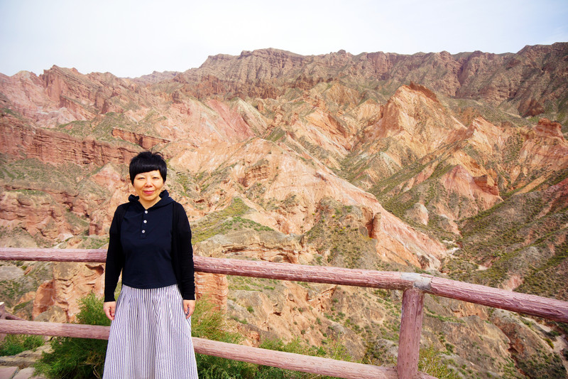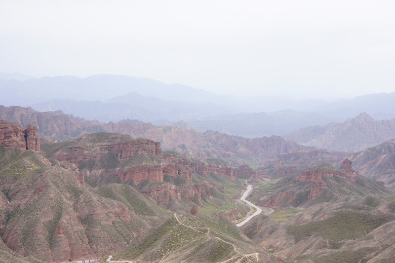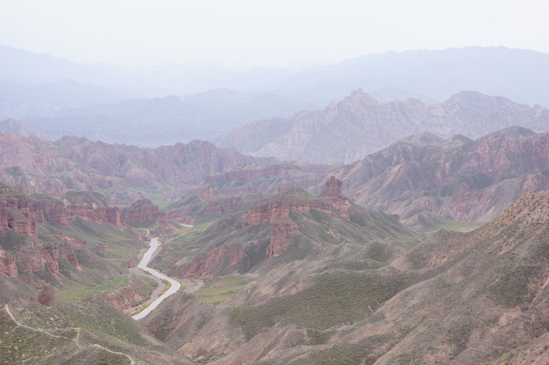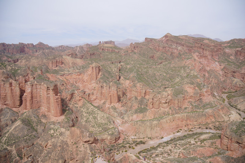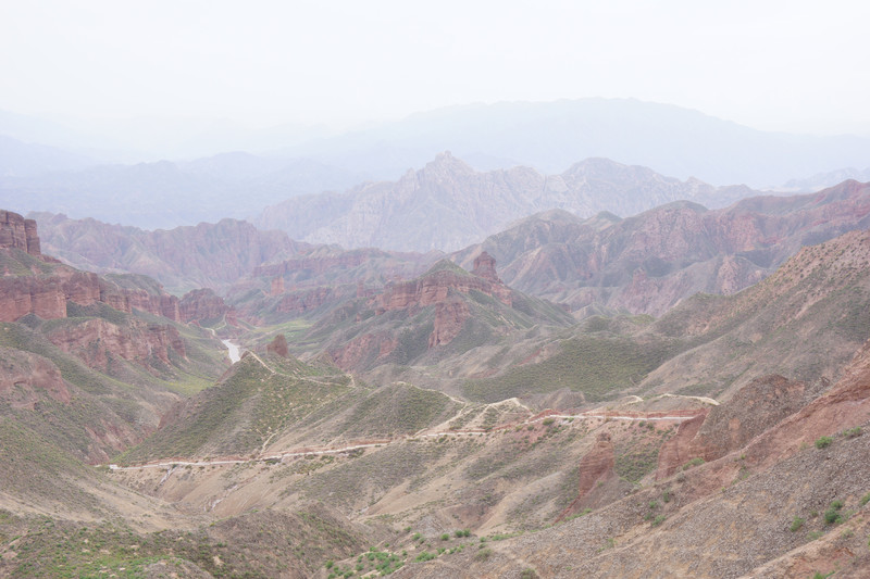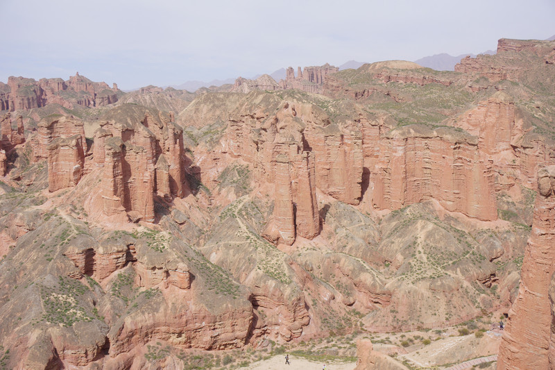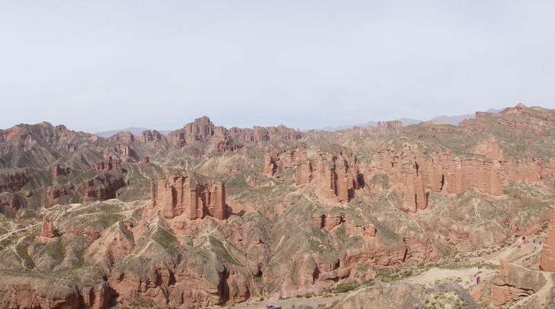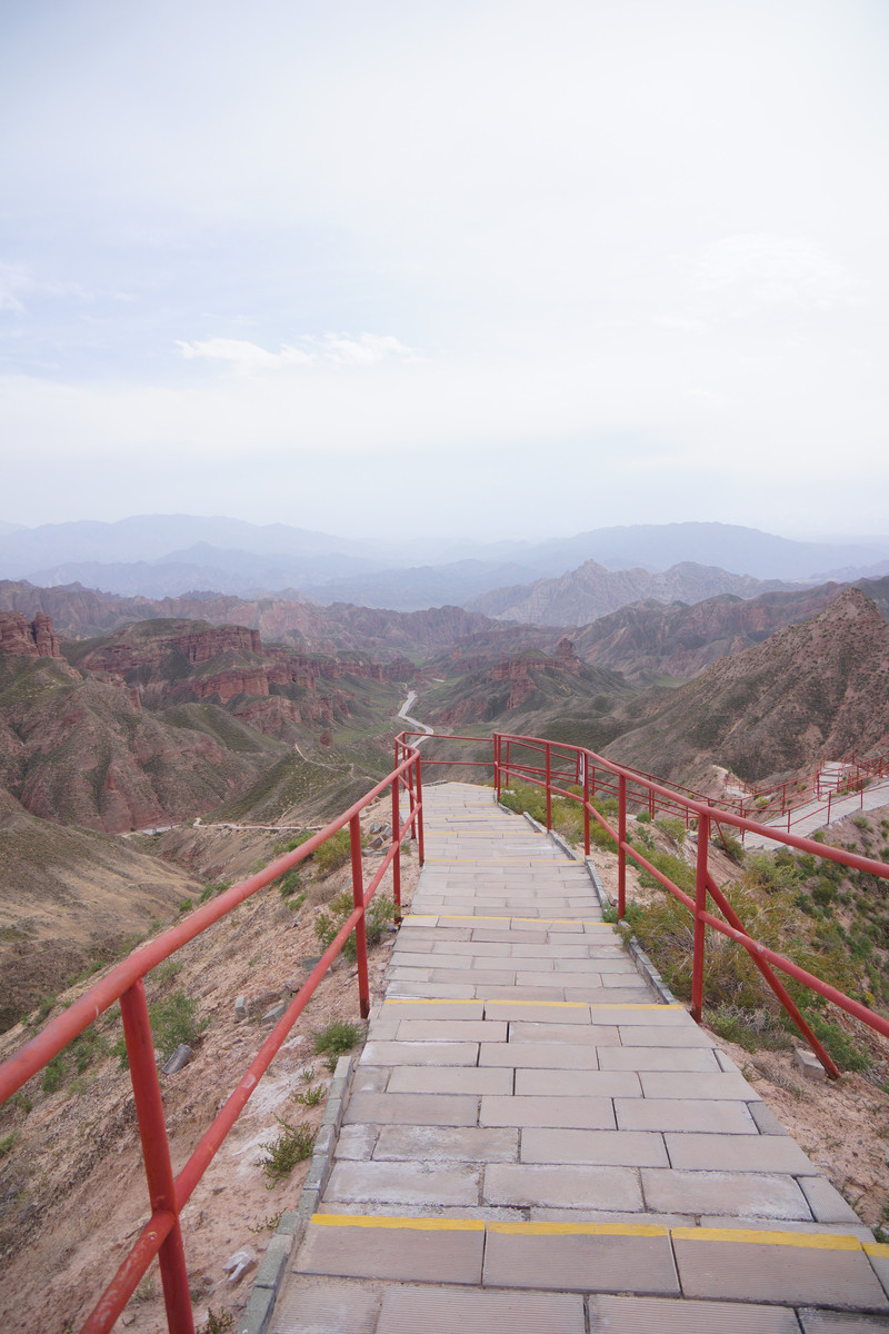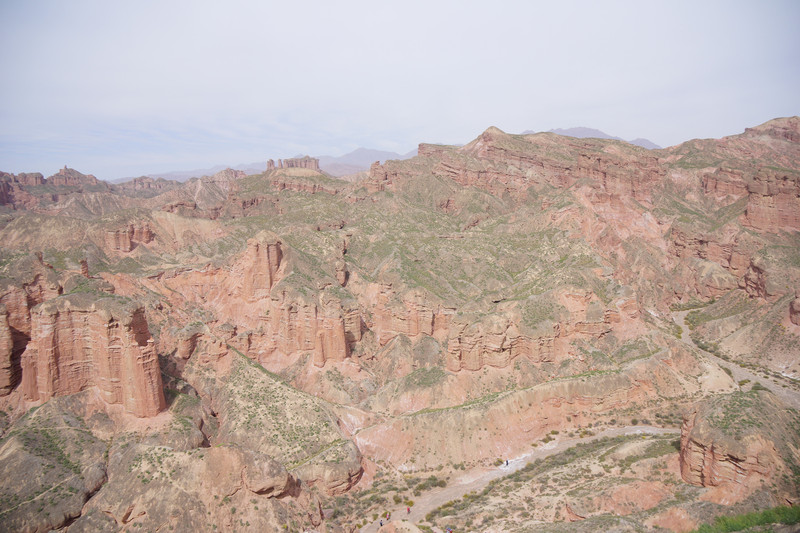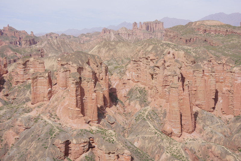 一路气喘吁吁爬上最高点,顿时一种雄浑壮阔的气息扑面而来。远眺这些神奇的丹霞地貌,尖峭挺拔,连绵不断;站在山顶还能看到远处祁连山脉上的雪,非常壮丽。(由于当天天空不是非常透亮,雪山在照片中不能体现,但在现场肉眼是真真切切地看到连绵的雪山。)