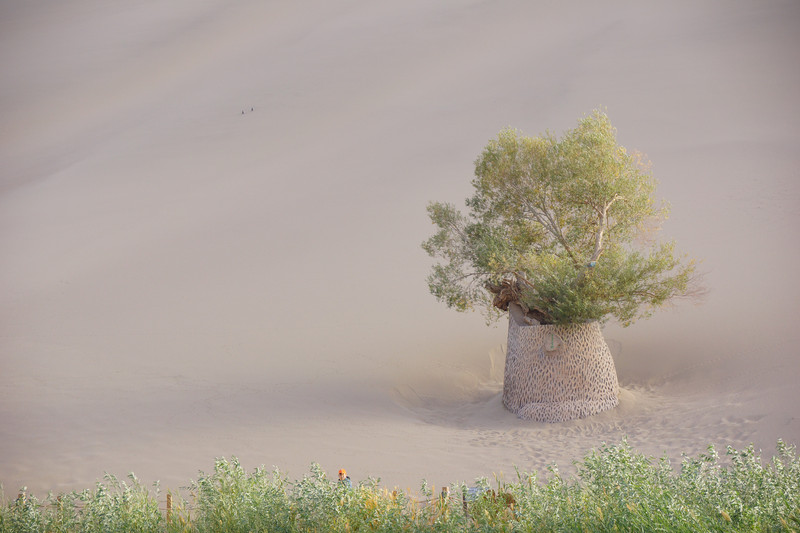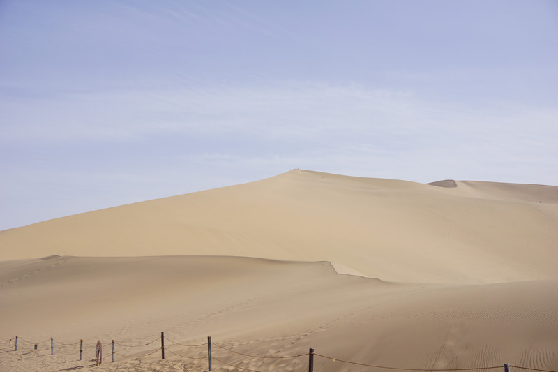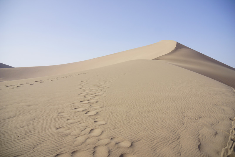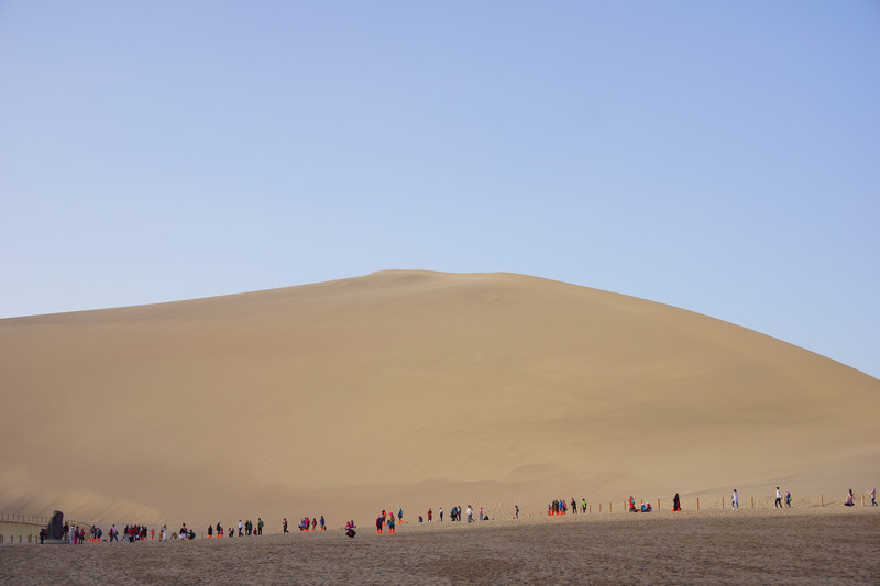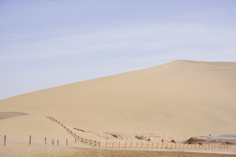 进鸣沙山会看到很多人的脚上都套着橘黄色的脚套,是为了防止沙子弄脏鞋子及灌进鞋里。但我建议来到鸣沙山,一定要光脚爬一下这个沙漠山啊,阻力小走得还更稳更快,而且沙很细很软,踩在脚底非常舒服。上山为了省力些,可沿着搭好的木梯走。