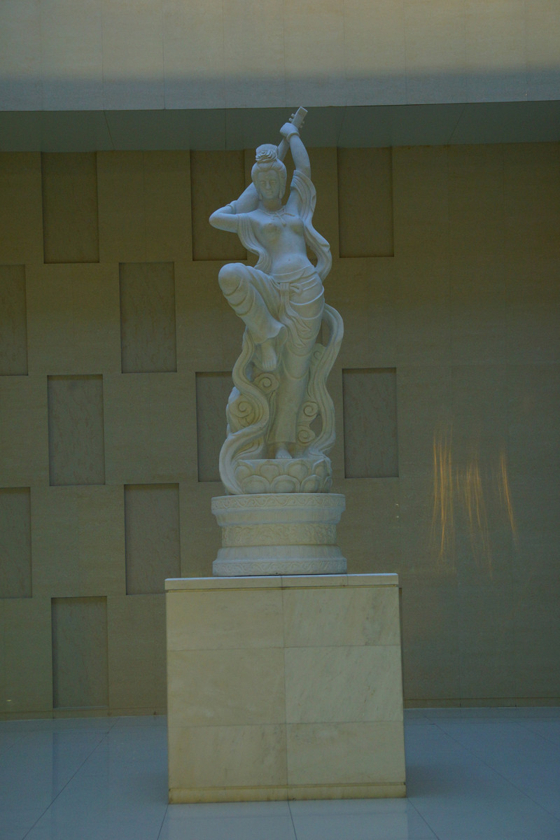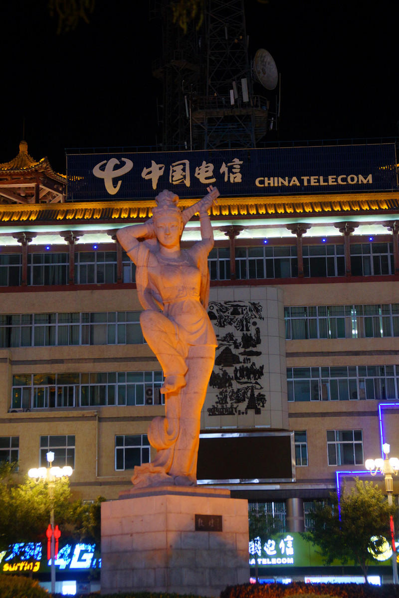 看,在敦煌市中心矗立着的“反弹琵琶舞伎”的飞天造型和在敦煌火车站候车厅的“反弹琵琶舞伎”的飞天造型,现在的飞天已经称为敦煌的形象大使。