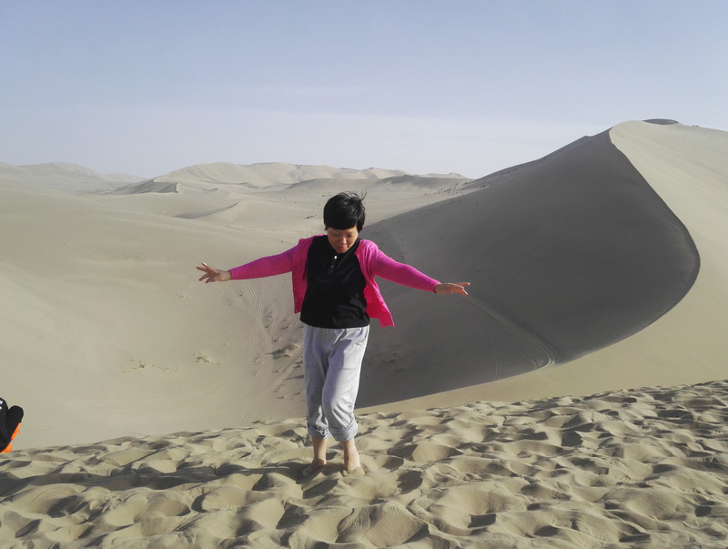 下山其实更轻松,看着坡就顺溜着往下踩,看起来坡很斜很危险的样子,实际异常稳当。脚斜着下,一扎一个坑,陷地贼牢,跟钉在沙里一样,倾斜度那么高的山啊,我居然可以一脚一脚稳扎扎地迅速移到了山脚下,真成“东方不败”了。