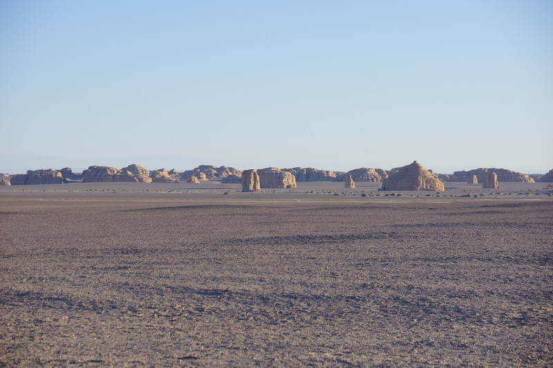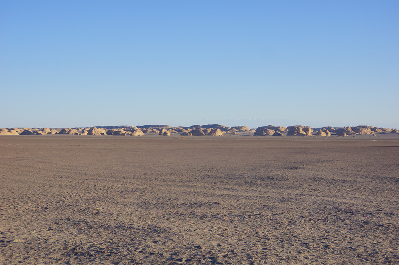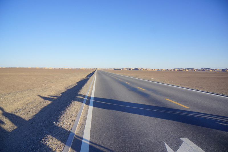 出了两关,到敦煌西线游的终点站即敦煌雅丹国家地质公园,俗称敦煌雅丹魔鬼城,中间要经过一大片荒无人烟的塞外戈壁,路边皆是五色沙,寸草不生;公路沿途非常荒凉,车开了很久,一路不见人影。终于,看见远方有一些起伏的土丘了…