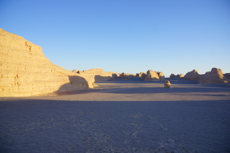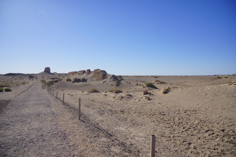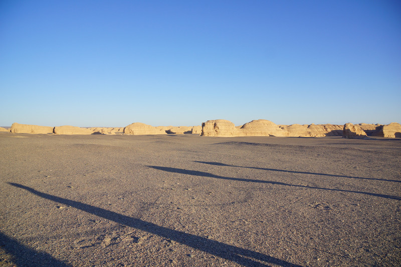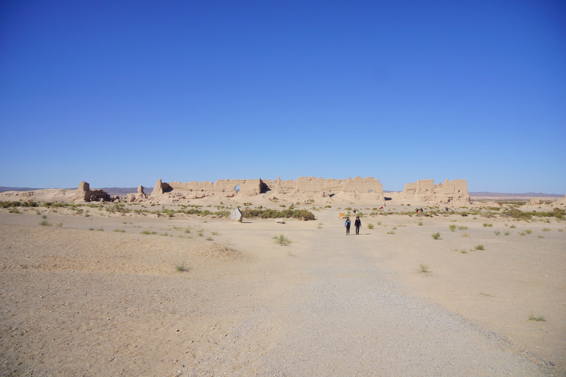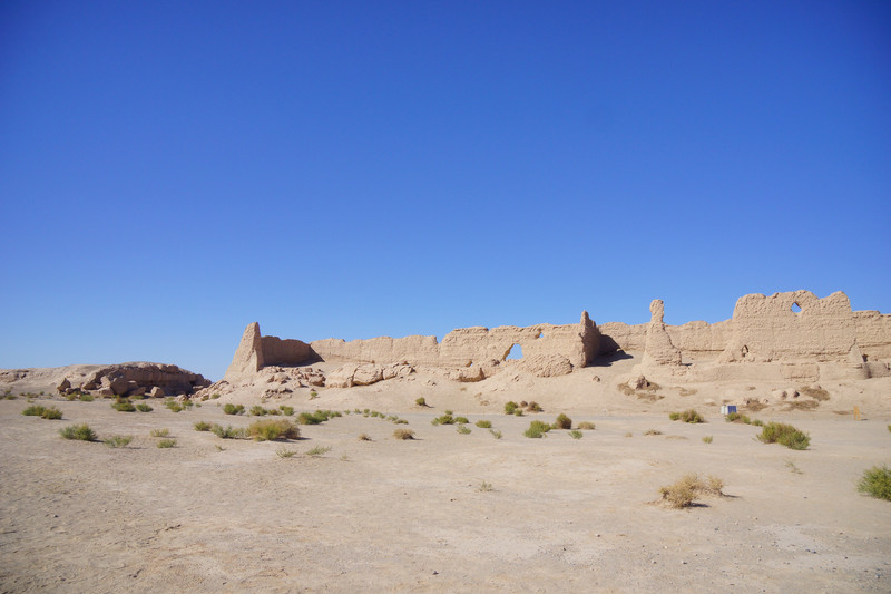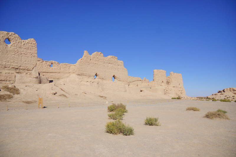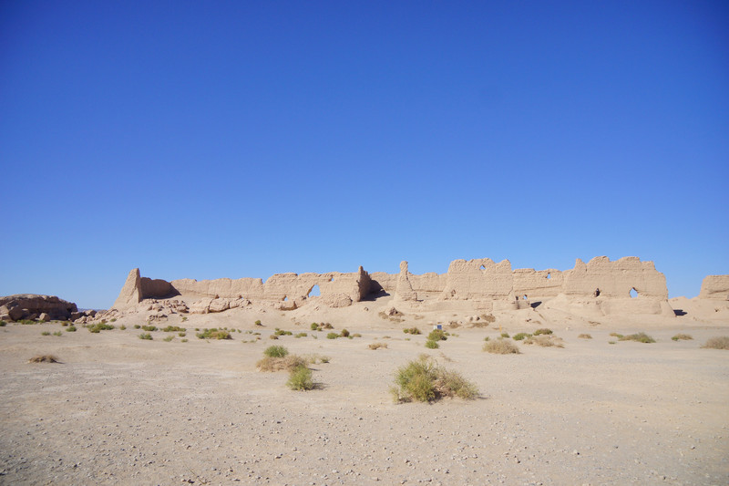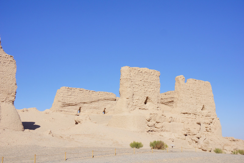 由于这座古城身处广袤无垠的戈壁之中,强劲的西北风刮走了戈壁表面的细纱,仅留下青灰色的粗沙粒,使其表面呈现出青色的波浪,一座座土黄色的古城堡耸立在青灰色的戈壁之上,衬以蓝天白云,显得分外妖娆。